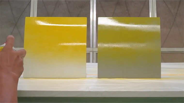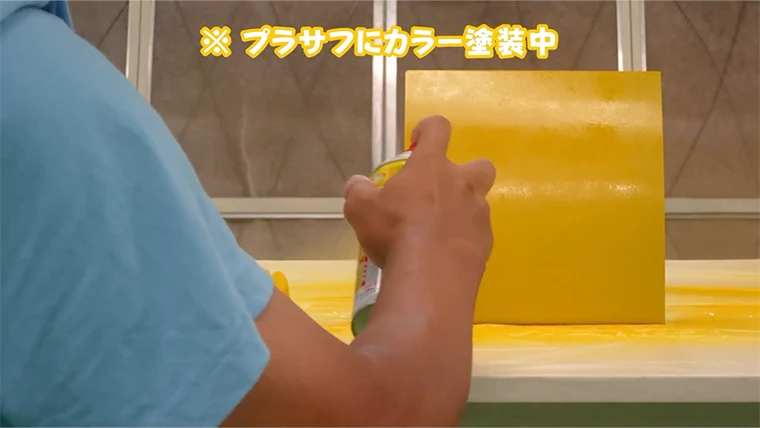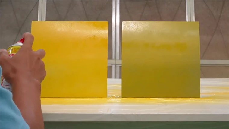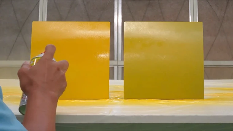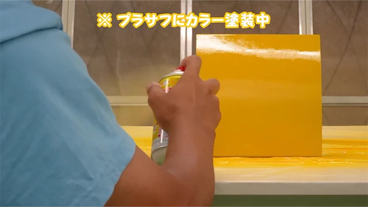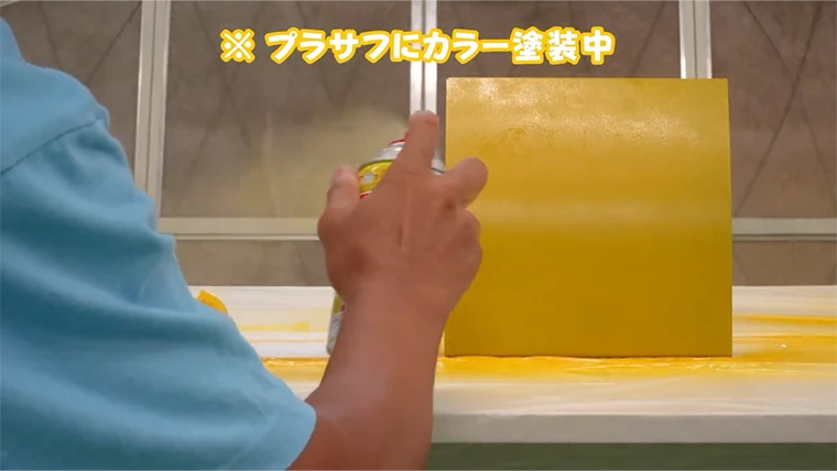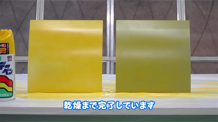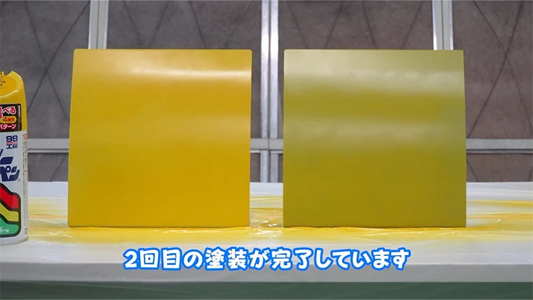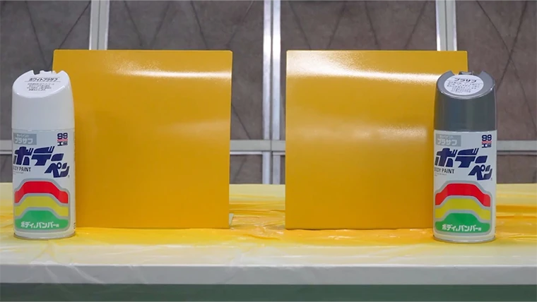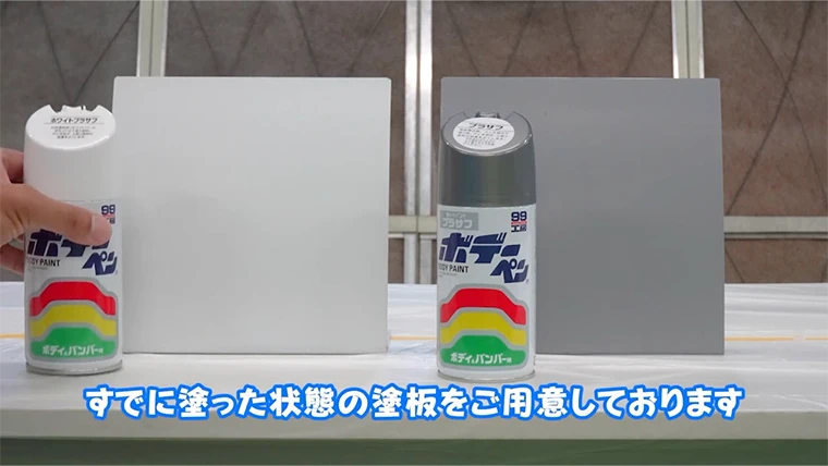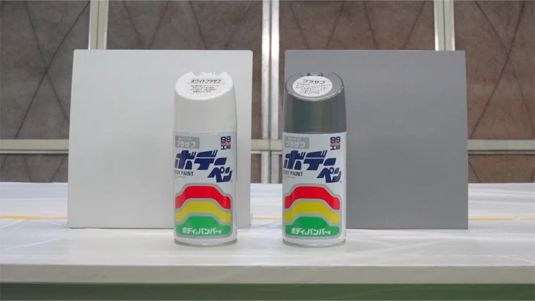 スギオカ今回は左の塗装板も右の塗装板もいっぺんに塗っていこうと思います。そうすることでより色の違いがわかっていただけるかと思われます。まずは1回目のスプレーです。