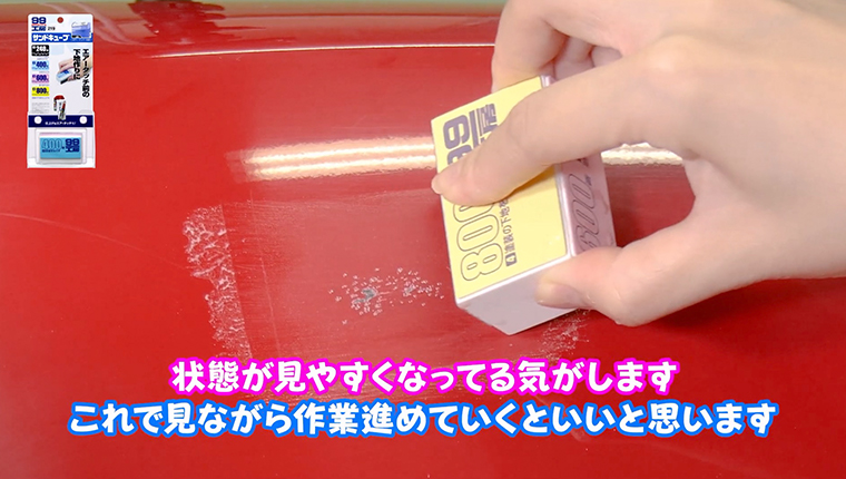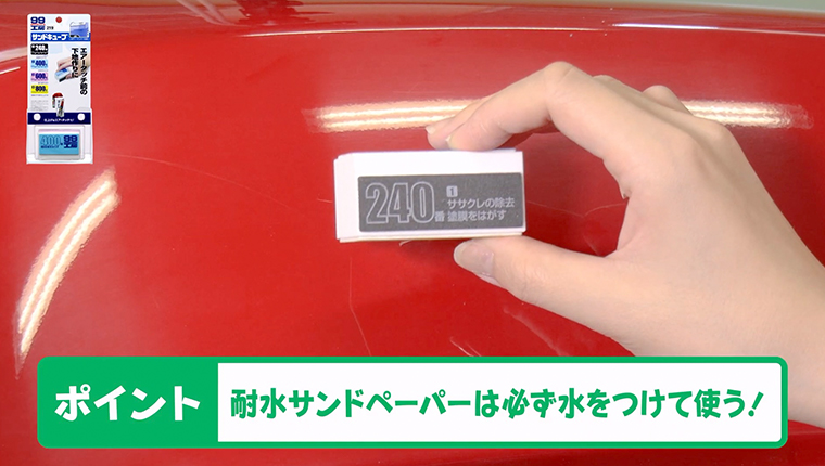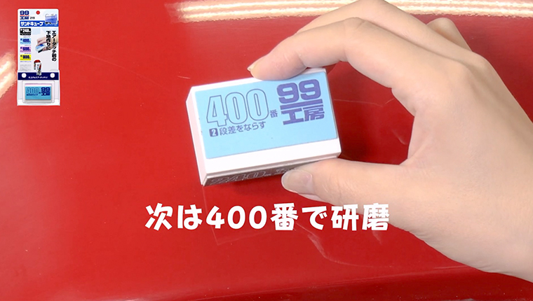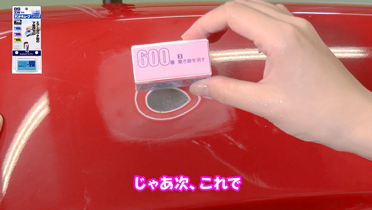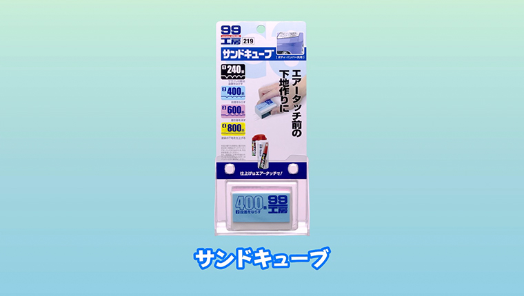 スギオカこのまま塗装補修するとキズの跡が目立ってしまうので、下地処理として、サンドペーパーでキズと塗装の段差をなくしていくんですが、今回は便利なものを用意しました。
