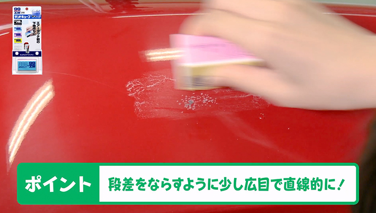 スギオカなるべく安定的に同じスピードで出すようにすると、塗りムラも少なくなり十分キズはキレイに消していけると思います。