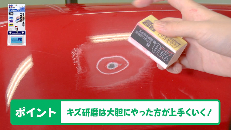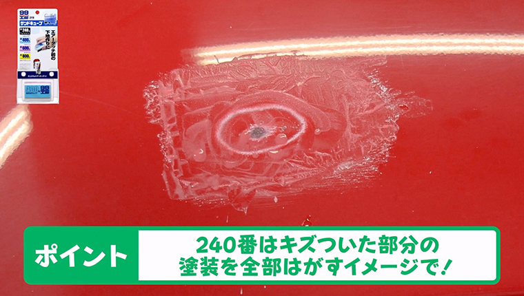 240番はキズついた部分の塗装を全部はがすイメージで!