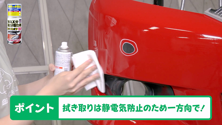スギオカあまり狭い範囲をスプレーするんじゃなくて、キズよりグッと広くスプレーして、最後は柔らかいウエスで拭き取って終了です。ウエスで拭く時も磨く時と同様、一方向の向きに拭いていきましょう。
