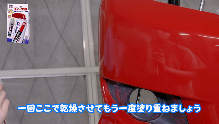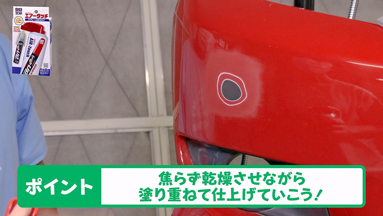 まずはキズの部分を中心に『エアータッチ』で消していきます。どうしても1度では消えないので何度か塗り重ねて消していきますが、塗り重ねたら乾燥、塗り重ねたら乾燥、というイメージでじっくりと仕上げていきましょう。