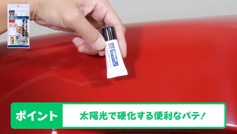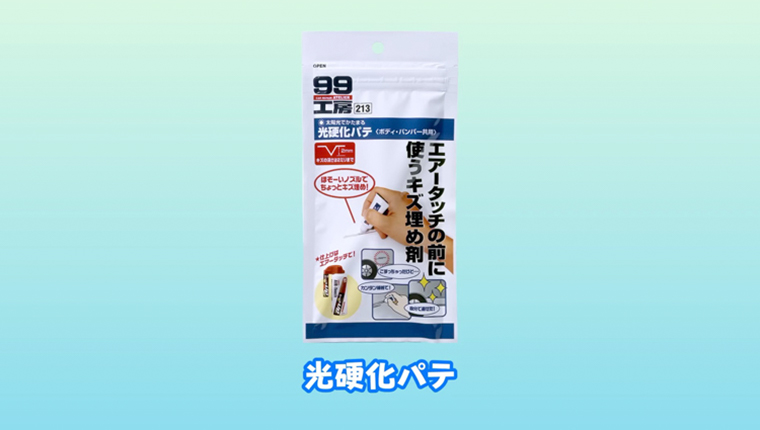 スギオカ今回使用するのはこちら、 『光硬化パテ』です。こちらでキズを埋めていきます。