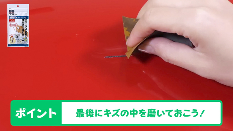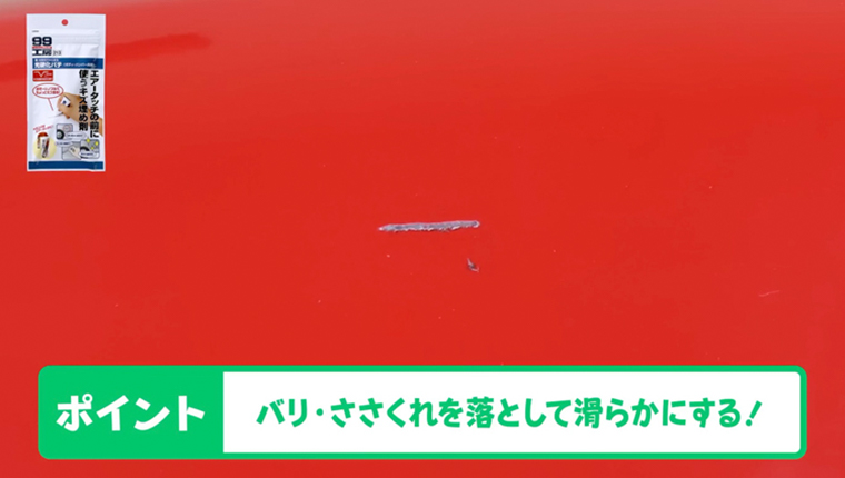 スギオカOKです。折ったサンドペーパーの角でキズの中を少し軽く擦ってください。これでパテの定着が良くなります。これも下地処理ですね。