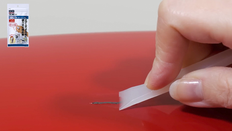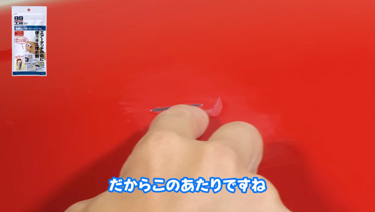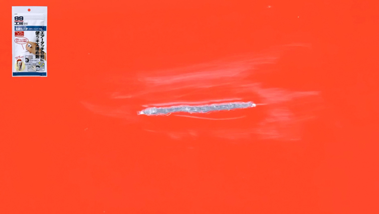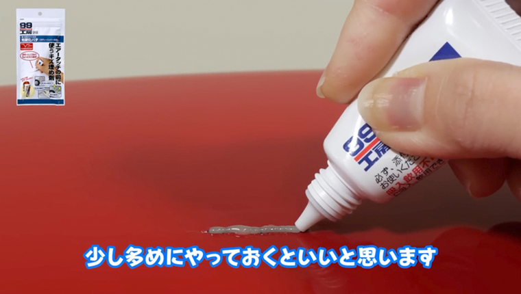 スギオカ細口のノズルになっているので、こういう線キズみたいなところへの使用にとても合っている商品です。キズに対して埋め込んでいくように出すことで、初めてパテを使う方でも簡単に使えます。