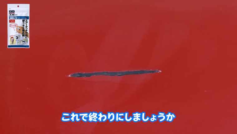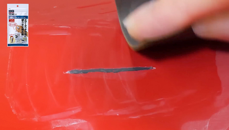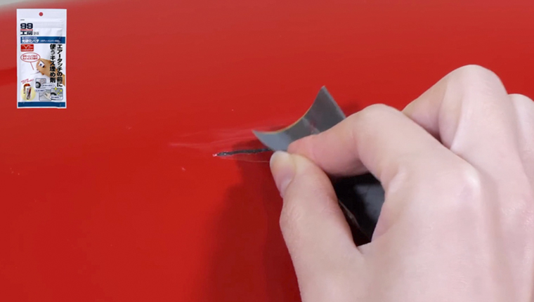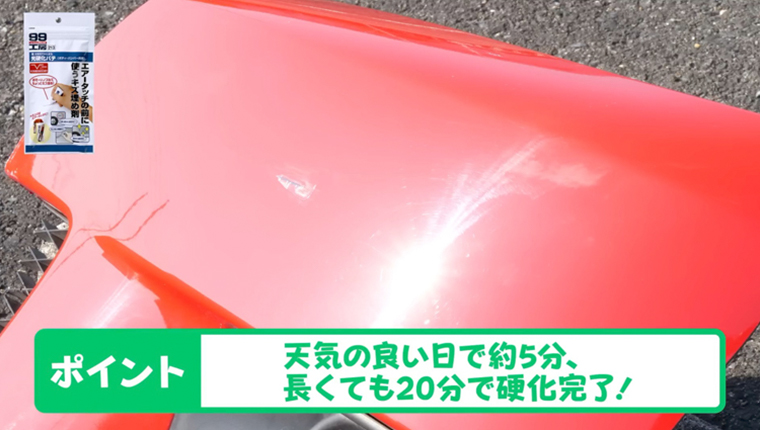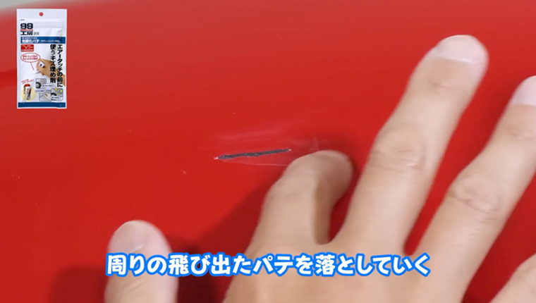 スギオカいいですね。線キズの中にパテがしっかり入っているのがわかるかと思います。このまま太陽光に当てて固めていきましょう。