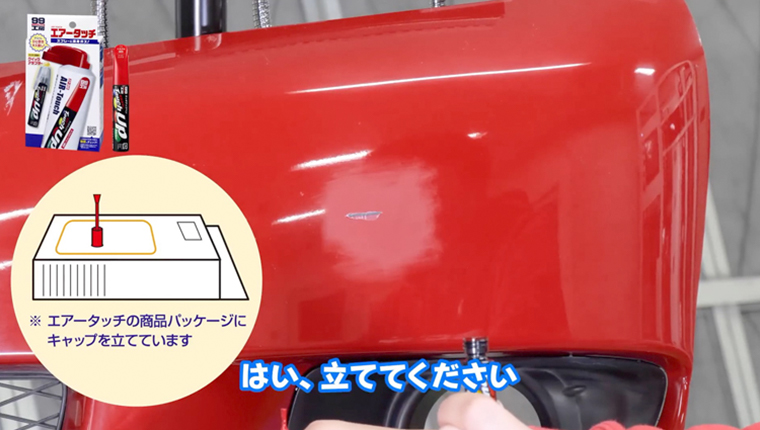 スギオカはい、しっかり混ざりましたね。では『タッチアップペン』のキャップを外しましょう。外したキャップは『エアータッチ』のパッケージに立てて置いておくと周りにつかないので安心です。