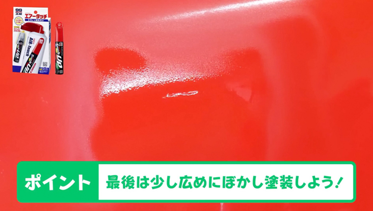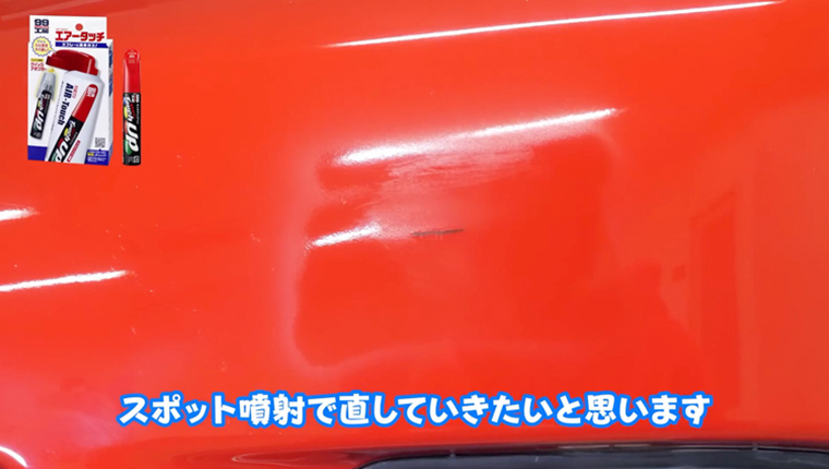 スギオカ今の状態としては耐水サンドペーパーの跡はほとんど消えた状態になっているんですが、キズ跡だけしっかり残ってしまっているので、メインとしてはそちらを消していくようなスポット噴射で直していきたいと思います。この『エアータッチ』はこういう狭い範囲に塗装するのも得意な商品です。