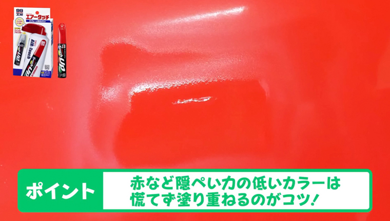 赤など隠ぺい力の低いカラーは慌てず塗り重ねるのがコツ!