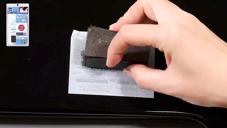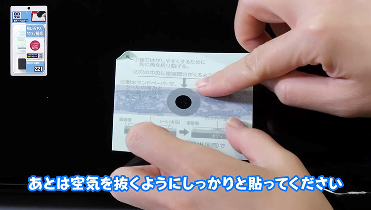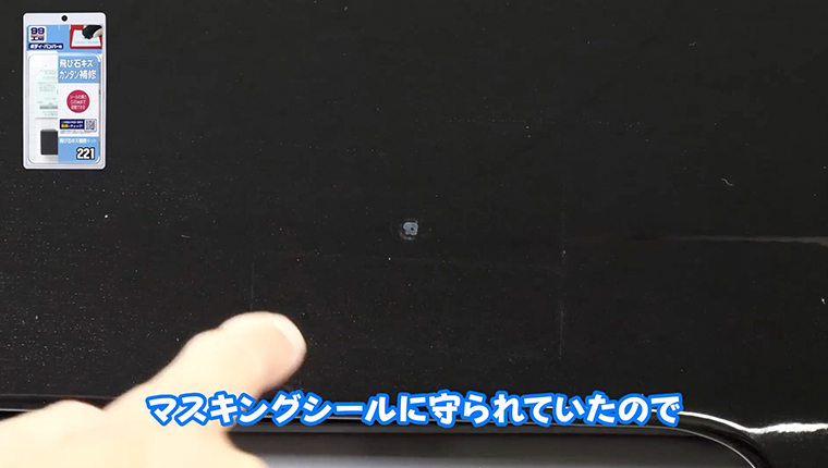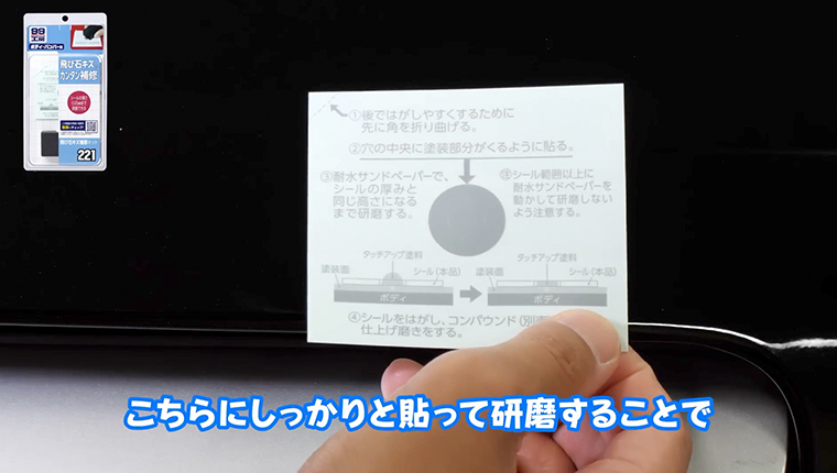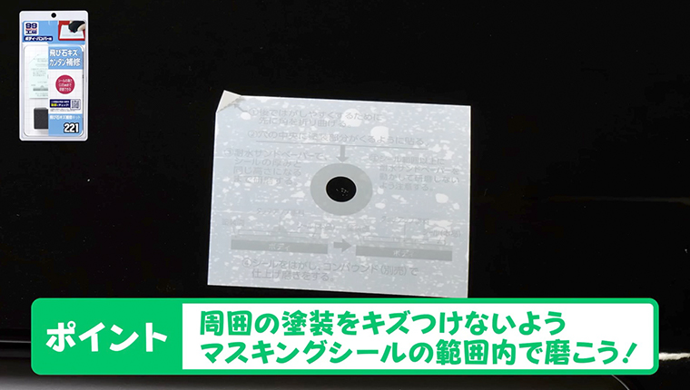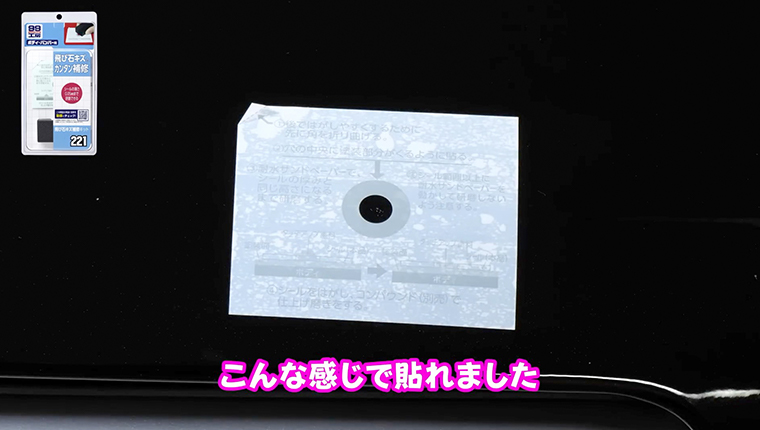 スギオカこちらは『飛び石キズ補修キット』の最大の売りなのですが、マスキングシールが入っています。それをこちらにしっかりと貼って研磨することで周りに余計なキズをつけずに作業していくことができます。