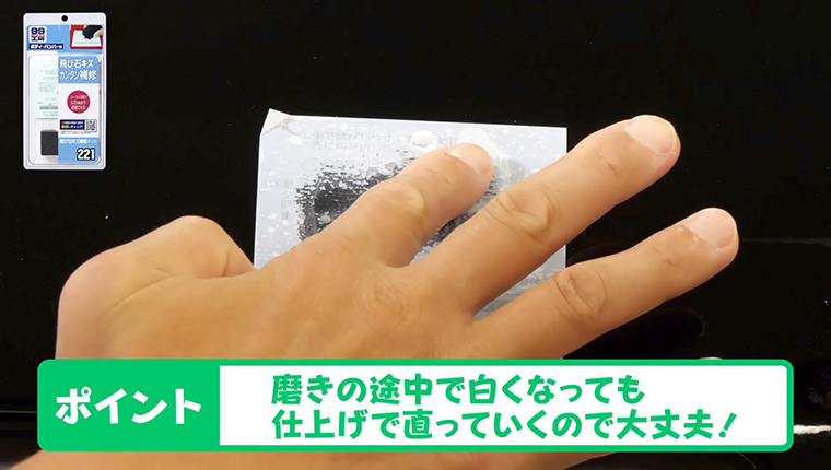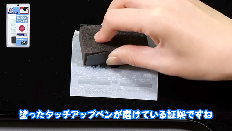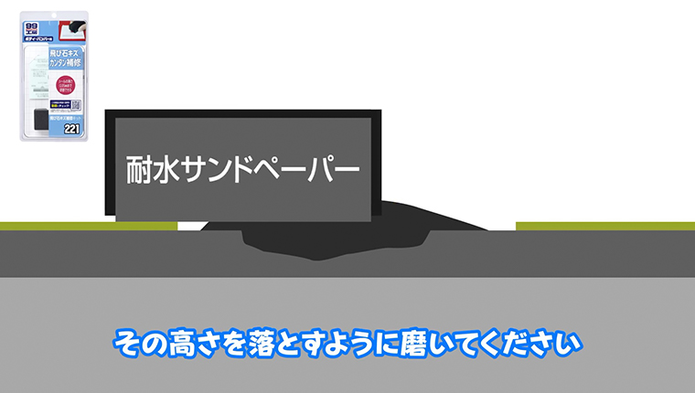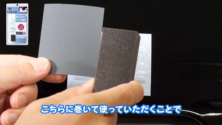 スギオカこちらを磨いていくにあたっては、この『飛び石キズ補修キット』の中に入っている耐水サンドペーパーを使うのですが、このままだと塗装した周辺までたくさんキズになっちゃいます。