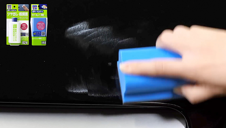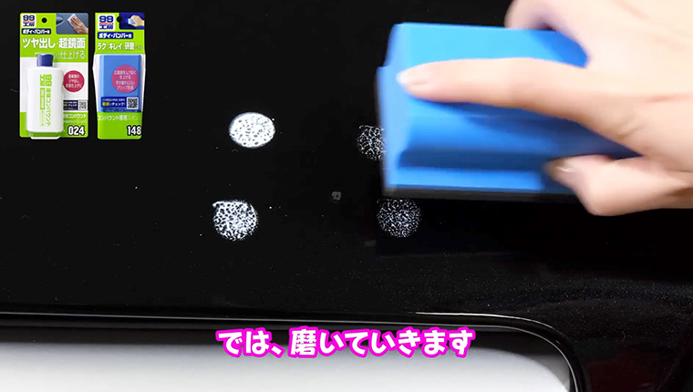 スギオカ磨き方は前回のコンパウンドの時と一緒ですね。『コンパウンド専用スポンジ』につけたコンパウンド液をペタペタと車体につけたら、その液を広げるように磨いていってください。