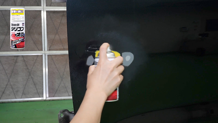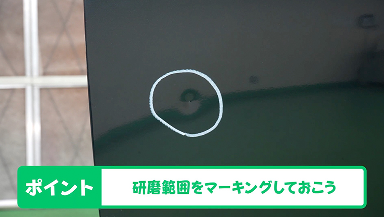 スギオカ自分の立ち位置を変えて映り込みを見ながら、どの範囲まで凹んでいるのかなというのを確認しましょう。確認できたらマーカーで補修範囲を丸で囲っておきましょう。