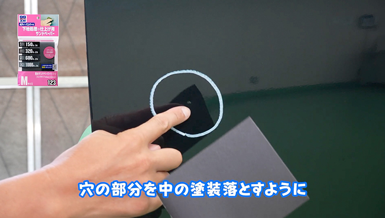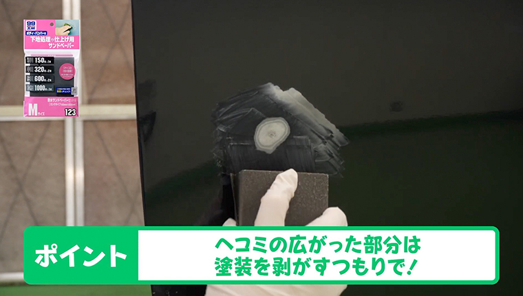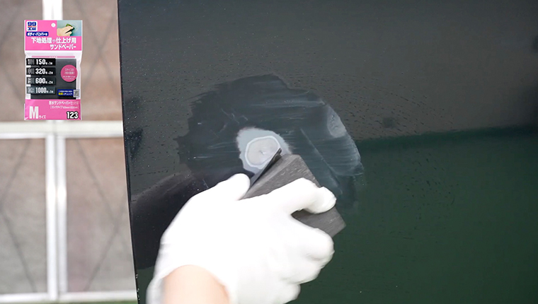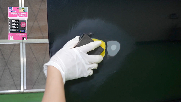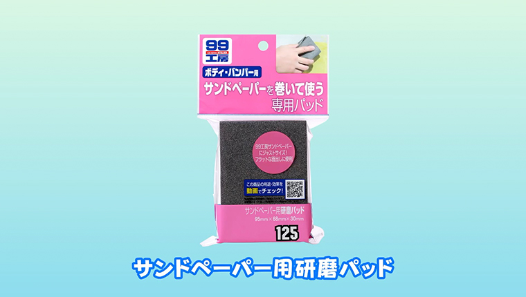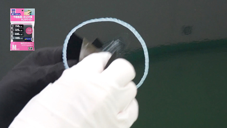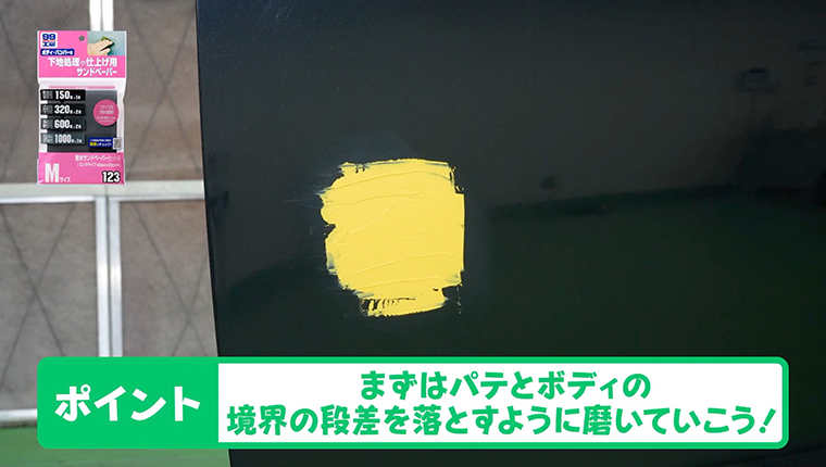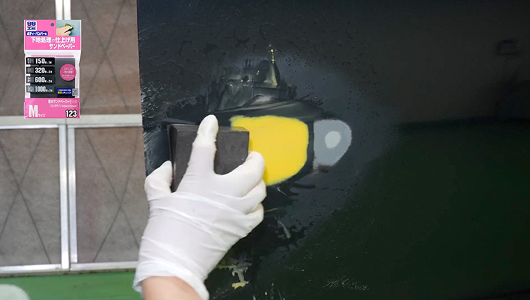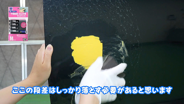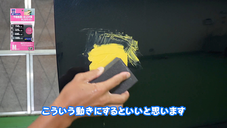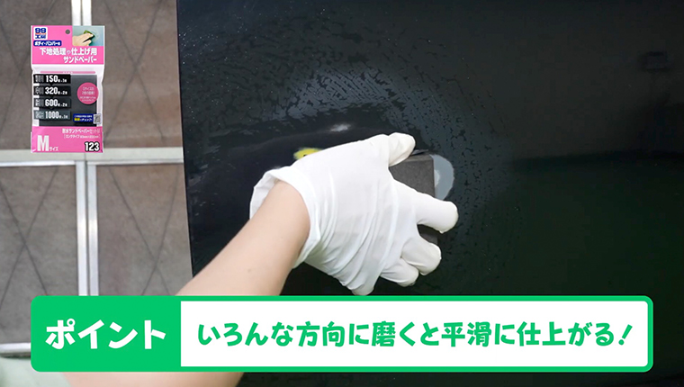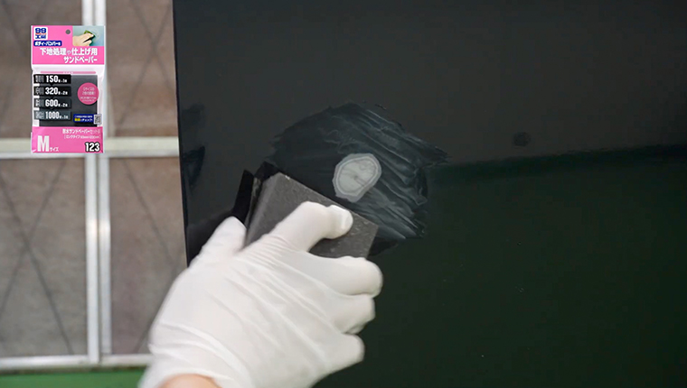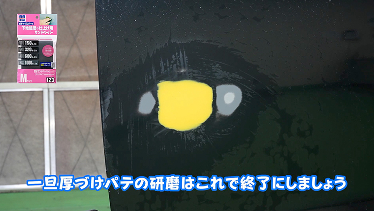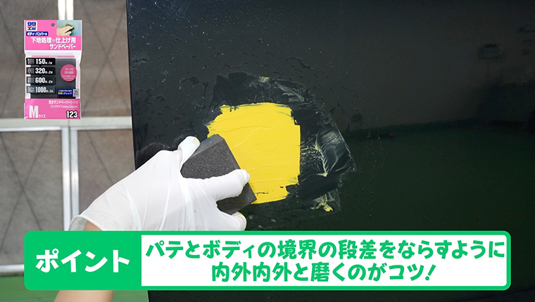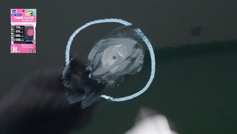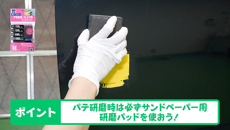 スギオカ怖がらずに、耐水サンドペーパーの面をしっかりとつけて研磨することですね。手で作業すると手の部分のパテだけがすり減ってしまいますが、『サンドペーパー用研磨パッド』を使うことで均一に研磨できるので、必ずパテの研磨時は『サンドペーパー用研磨パッド』を使いましょう。