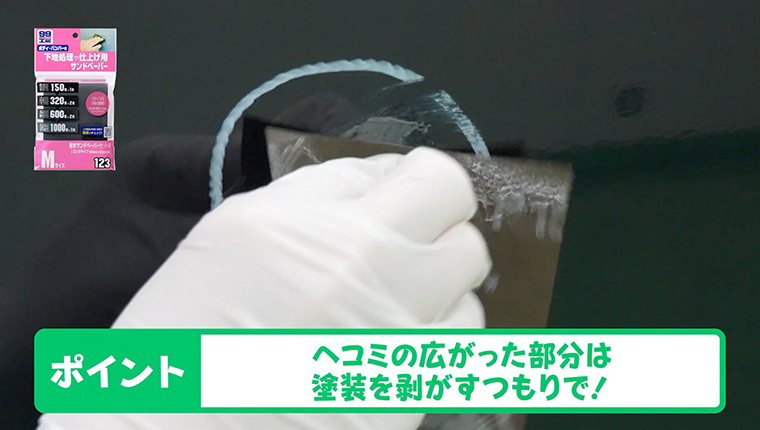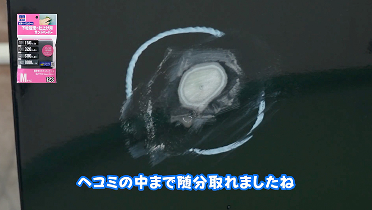 スギオカ大丈夫です。少しへこみの広がったところまではしっかりと塗装を剥がしちゃうぐらいの気持ちで構わないので研磨しましょう。