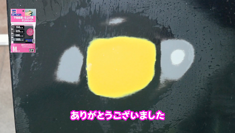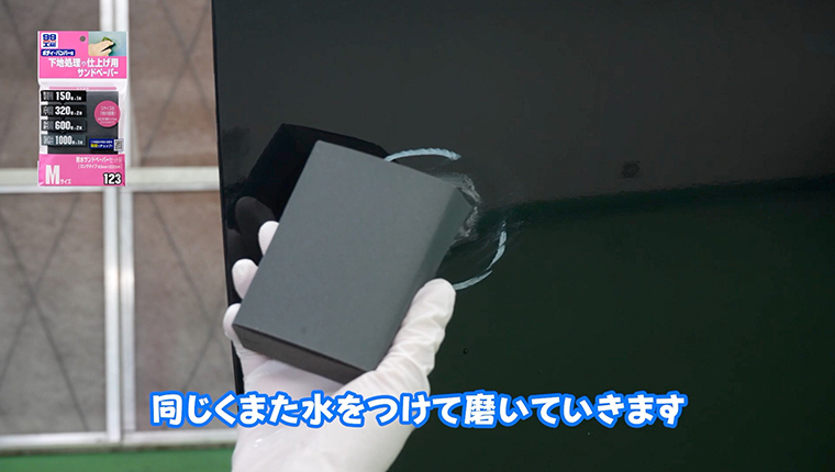 スギオカでは水とつけて、作業していきましょう。パテの周り部分にもキズがついていきますが、気にせず研磨していってください。