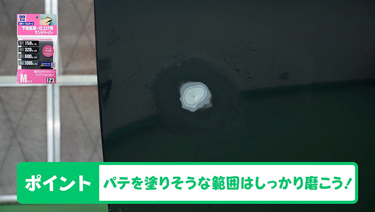 スギオカ先程研磨した箇所とその少し広い部分については、足付け処理と言って少しペーパーでキズをつけることによってパテが密着しやすくなりますのでしっかり研磨しておきましょう。