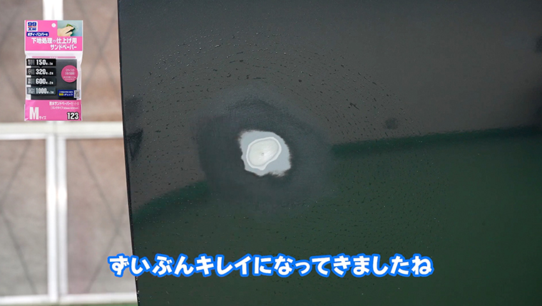 スギオカしっかりと削れて、へこみの中まで随分取れましたね。では耐水サンドペーパーを150番から320番に替えて研磨していきたいと思います。