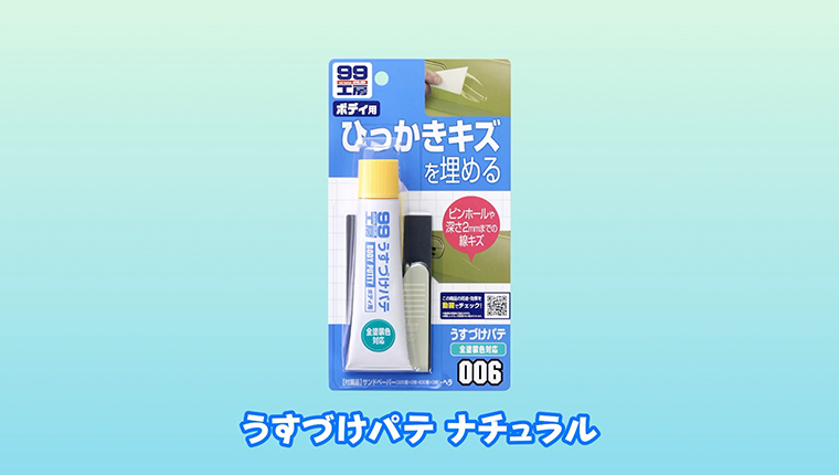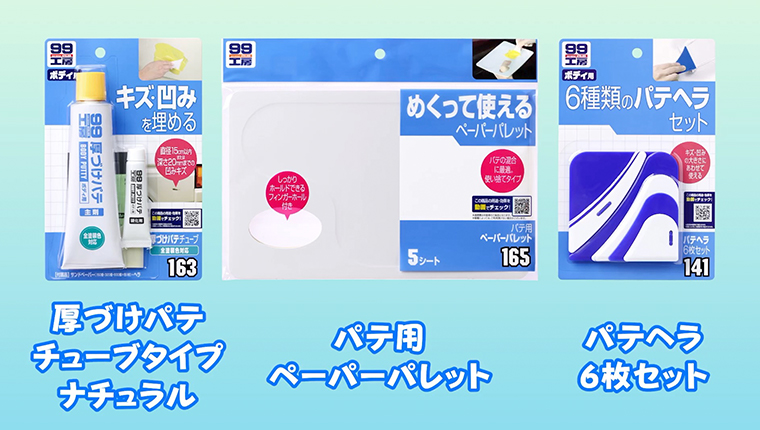 スギオカ一番左のこちらは『厚づけパテチューブタイプ ナチュラル』です。ボディ用のパテですね。真ん中は『パテ用ペーパーパレット』、一番右は『パテヘラ6枚セット』です。こちらを使っていきましょう。