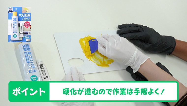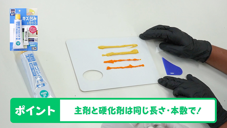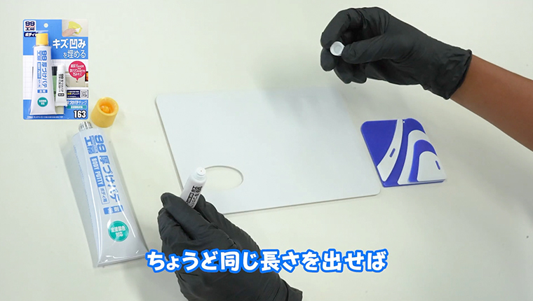 スギオカそれでは早速やっていきましょう。まずは主剤と硬化剤を『パテ用ペーパーパレット』の上に出していきます。同じ長さになるようにしましょう。
