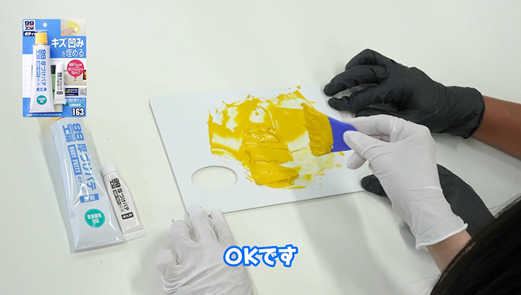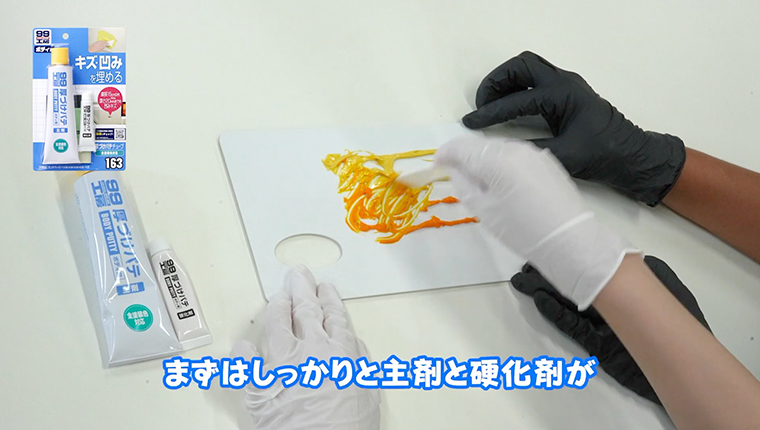 スギオカでは準備をしていきます。まず、こちらの『厚づけパテチューブタイプ ナチュラル』ですが、主剤と硬化剤の2本が入っています。こちらを100:2の割合で混ぜていきます。