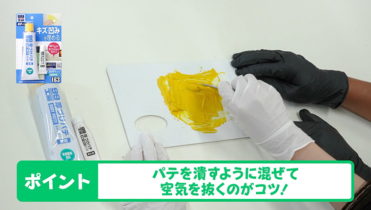 スギオカある程度混ぜてからのコツとしては、1度パテを盛るようにまとめて、空気を抜きながら潰していくイメージで、ヘラでパテをパレット上に伸ばしていくことですね。