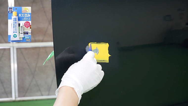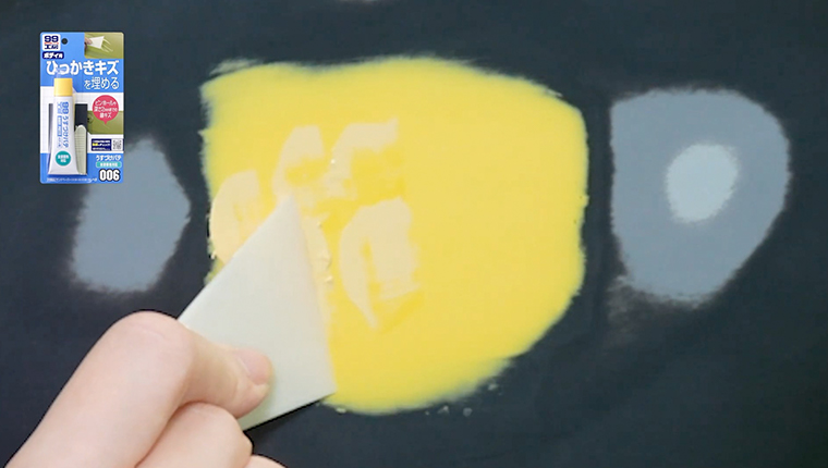 スギオカパテの混合が終了しましたので、こちらをへこみ部分に盛っていきたいと思います。塗り方ですが、まずは凹んだ部分から先にパテを埋めていきましょう。