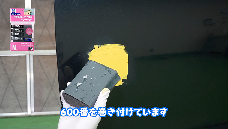 スギオカそうです、こちらは『サンドペーパー用研磨パッド』に600番の耐水サンドペーパーを巻き付けています。こちらに水をしっかり付けて研磨していきます。