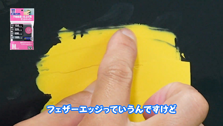 スギオカ境界部分をみてください。このようにパテがかすれてボディの色が見えている箇所があるかと思います。これを“フェザーエッジ”と言うんですけど、こういうエッジが出てくると徐々に段差が分からなくなってきます。