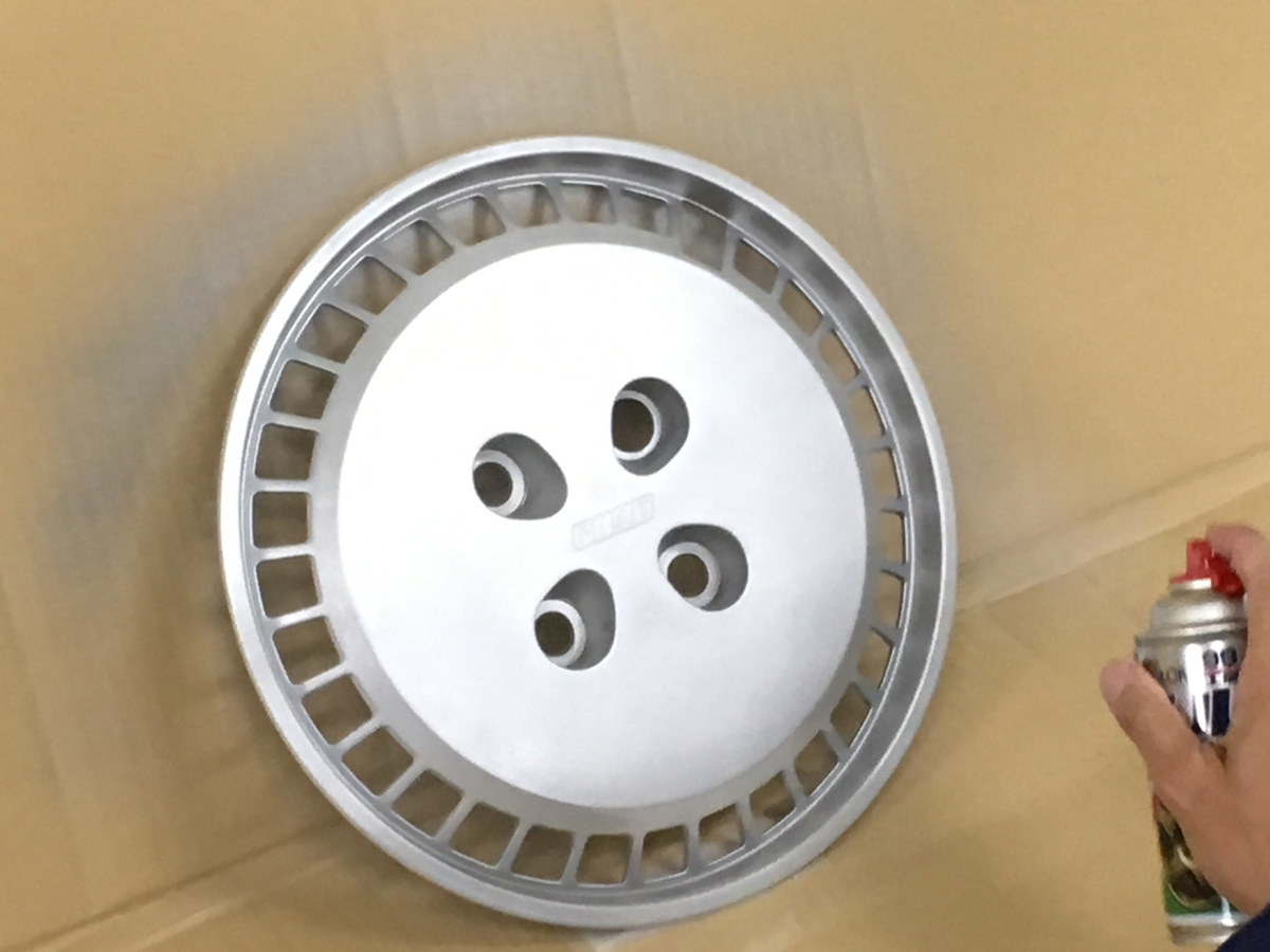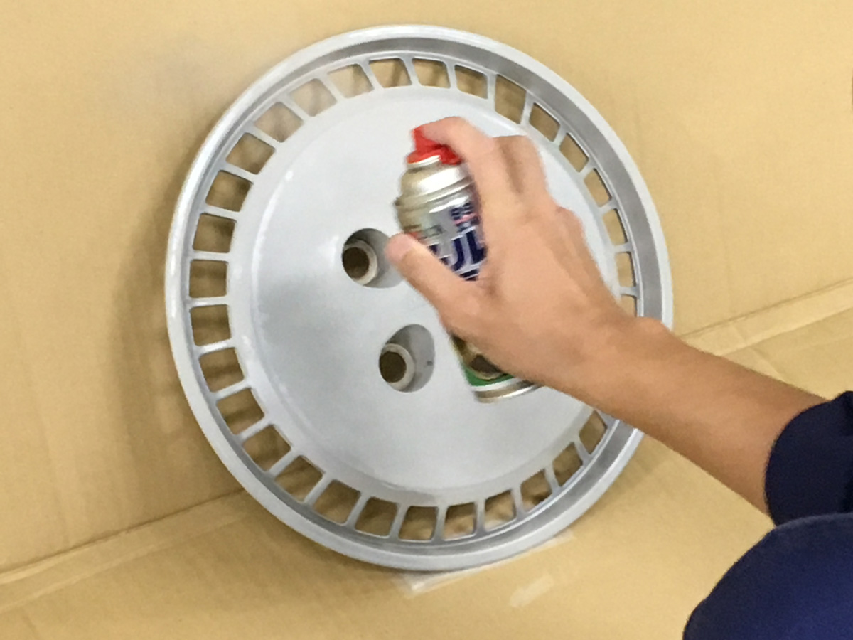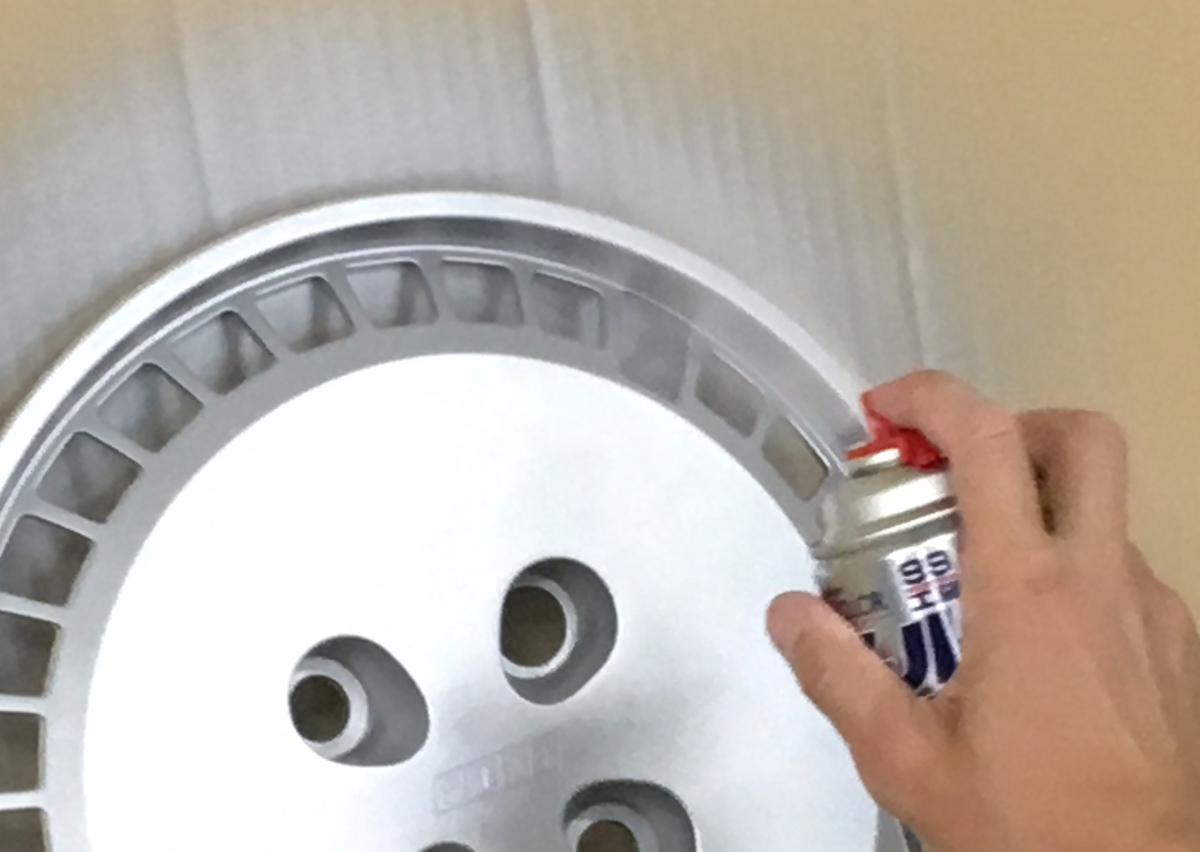 今回のように樹脂製のホイールキャップやアルミホイールにも下塗り塗装なしでスプレーすることができ、振動の大きな箇所にも強く密着し、剥がれにくいホイール専用のペイントです。色目はシルバーカラー、塗装後の最終仕上げ用のクリアーを用意しました。