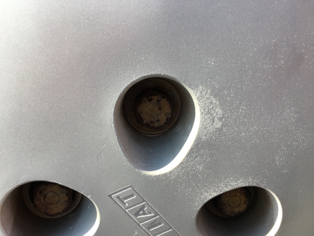ということで早速ホイールキャップを再生していきます。ただ困ったことに、現在のホイールキャップはスチールホイールにはまった状態となっているだけなので簡単に外れるのですが、こちらの「FIAT-PANDA」のホイールキャップはナット(正しくはボルト)でスチールホイールと一緒に固定されているため、ボルトを一度全て外してしまう必要があります。せっかくの機会ですので、随分汚れていそうなスチールホイールを一緒に洗っておくため、タイヤ+ホイールを外すこととなりました。