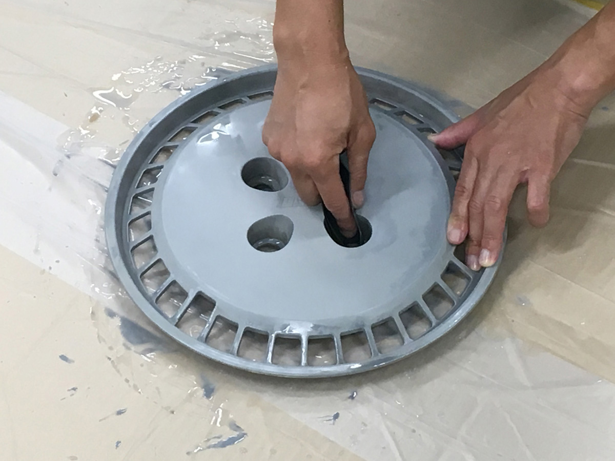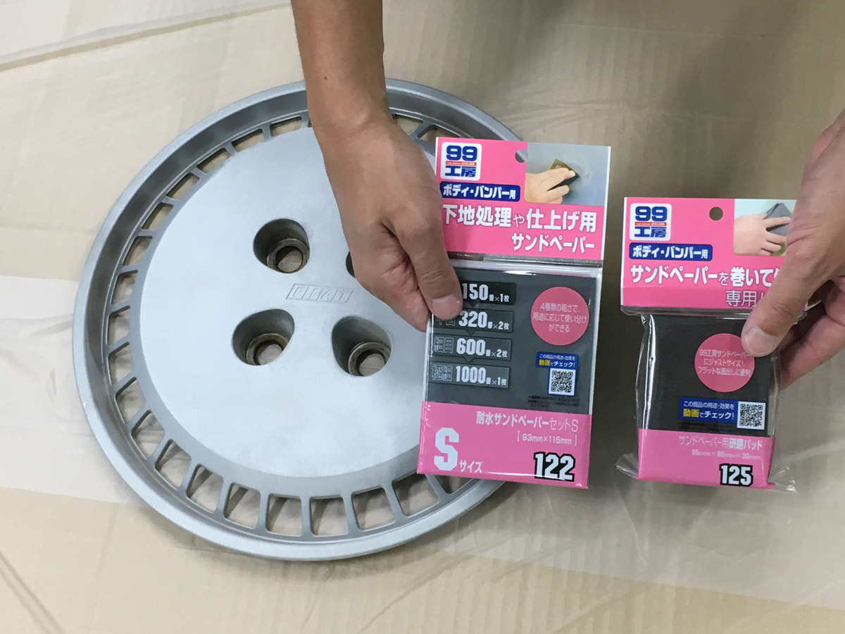 ここから、塗装前の下地処理を行います。 方法はとってもカンタンです。キズ付いた部分や塗装剥がれの部分は、『耐水サンドペーパーセット』で磨いて、ホイールキャップ表面に段差がなくなる状況を作ります。