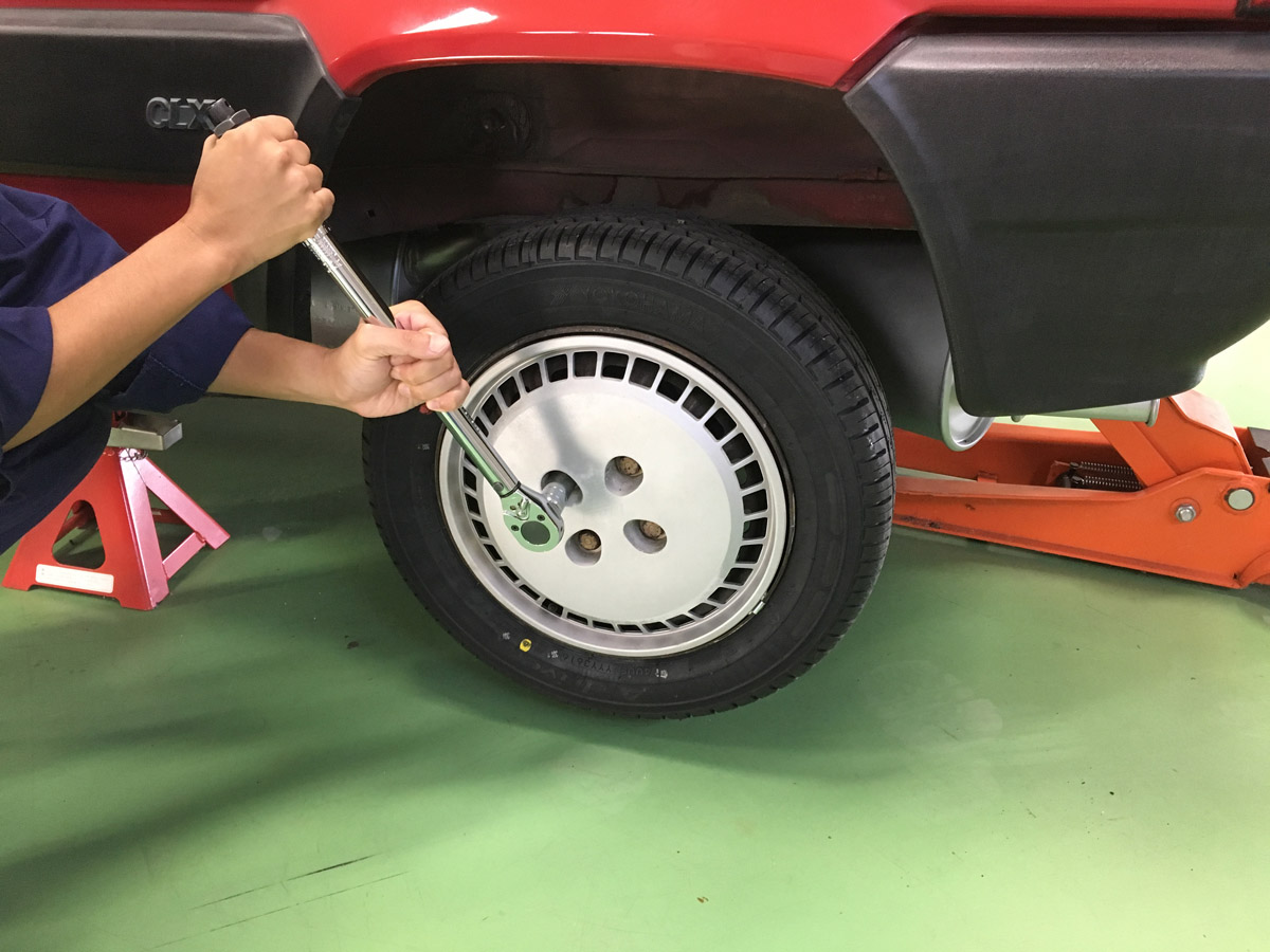 まずは、全てのナットをある程度緩めます。その後、フロアジャッキで車高を上げ最終ボルトを全て抜きとってしまいます。