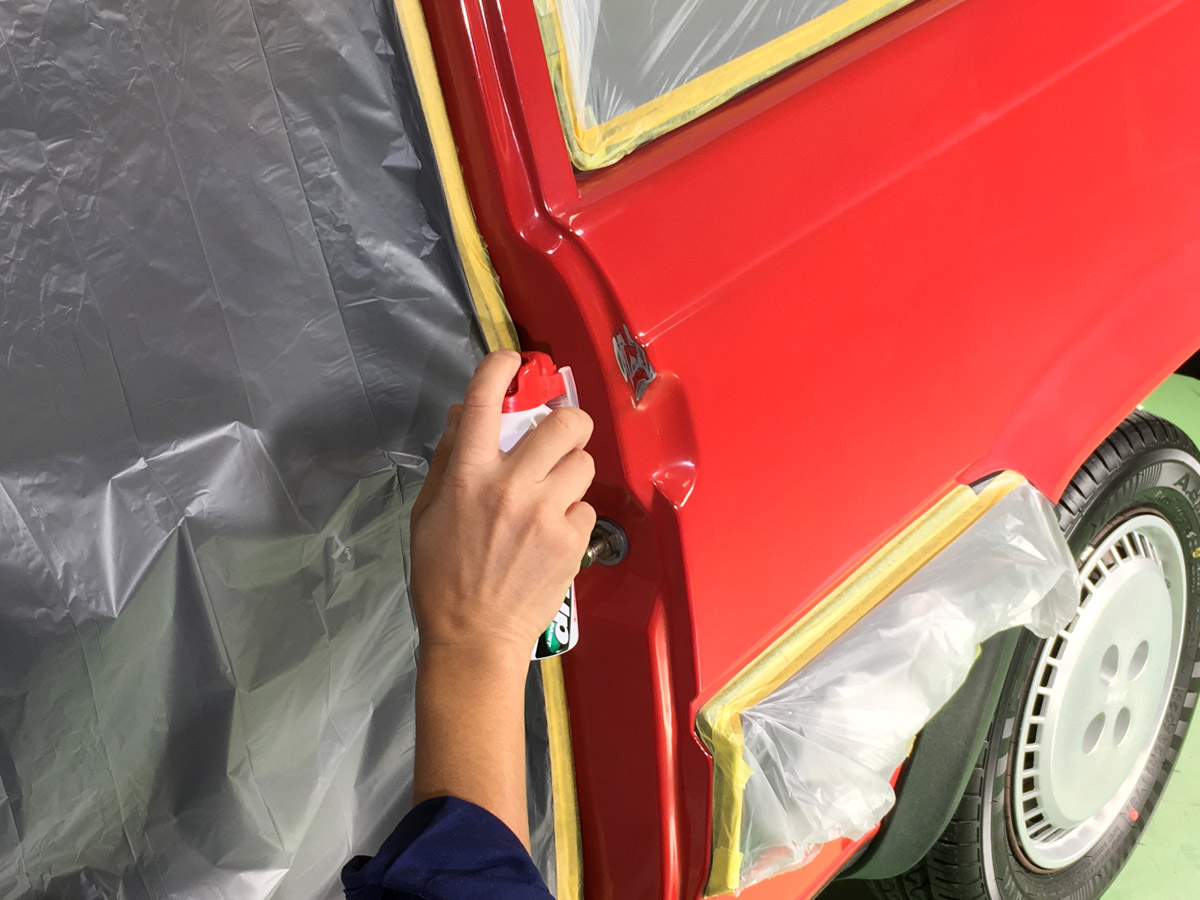 この『エアータッチ』ホビーなどで使用するエアーブラシのように狭いスペースに塗装することができる極細のスプレーなので、周辺への飛び散りも少なく塗装できるのが特長。とはいえ、今回はドアの当たり部で塗料が車内に付着してしまうことが考えられるので、ドアの入口部分と未塗装樹脂パーツ部分、念のため窓にもマスキングをします。