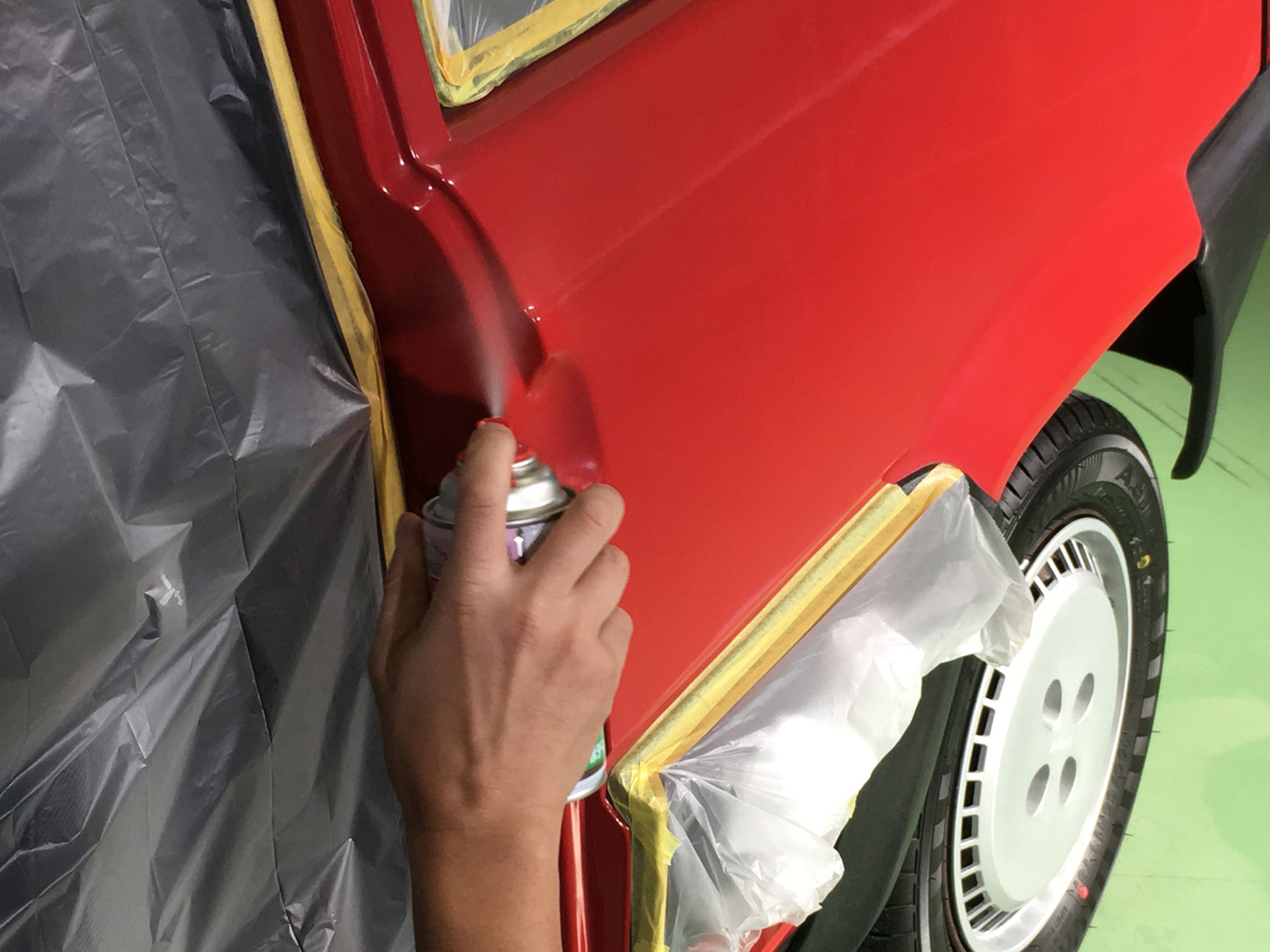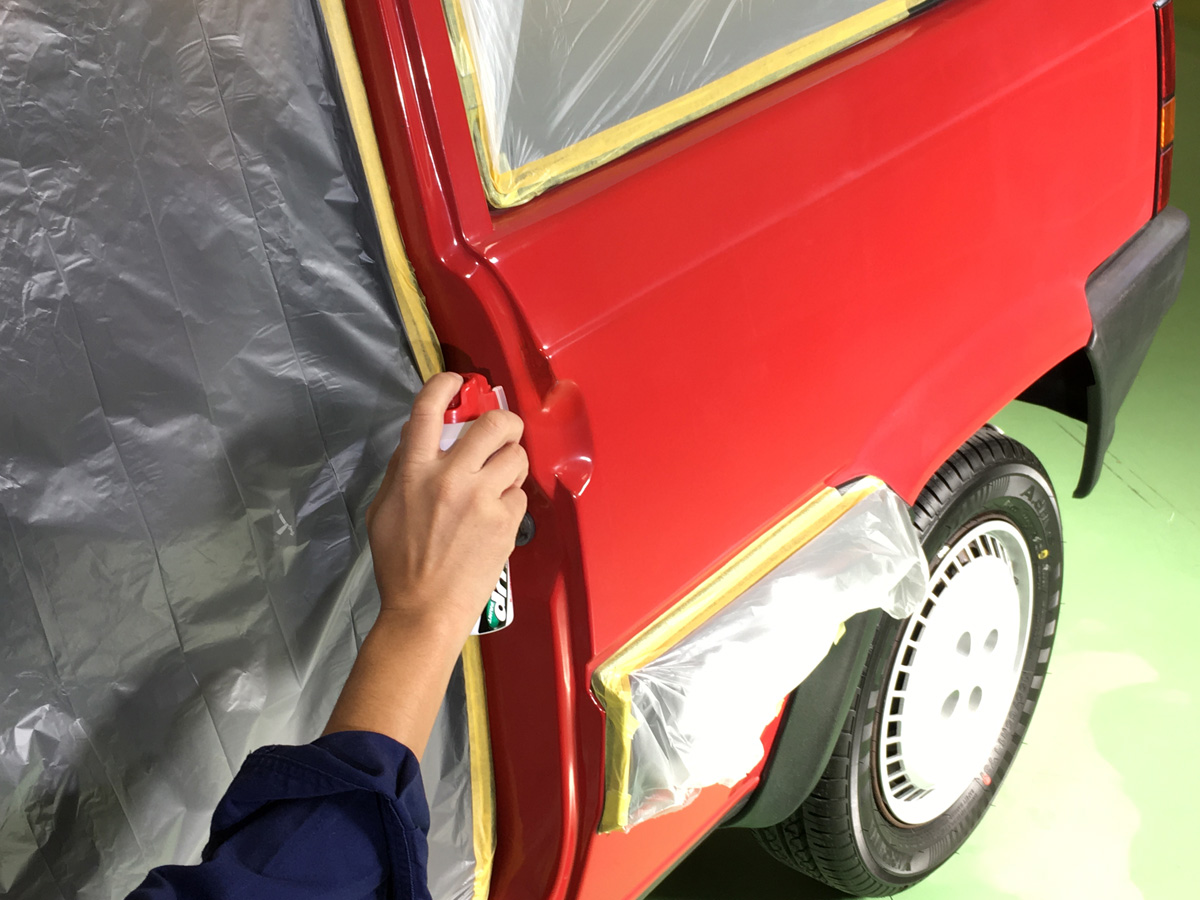 ここから塗装に入るのですが、ちなみにこちらの車のカラーはROSSO SWIFT M.S.(カラー№129)というもの。随分古いカラーなので、現在の99工房の『タッチアップペン』のカラーラインナップには存在しないため、調色システム『オーダーショップ』で作成したものです。
