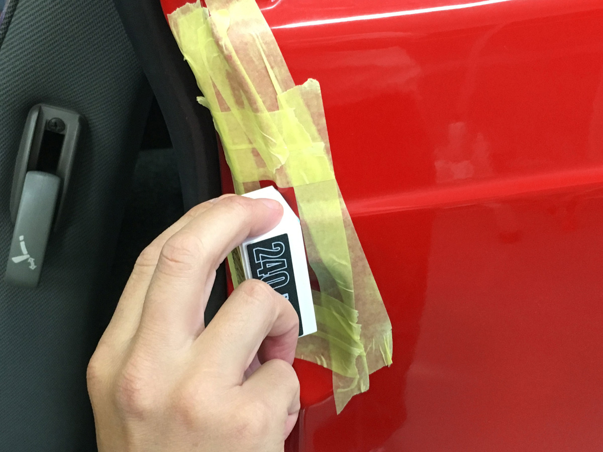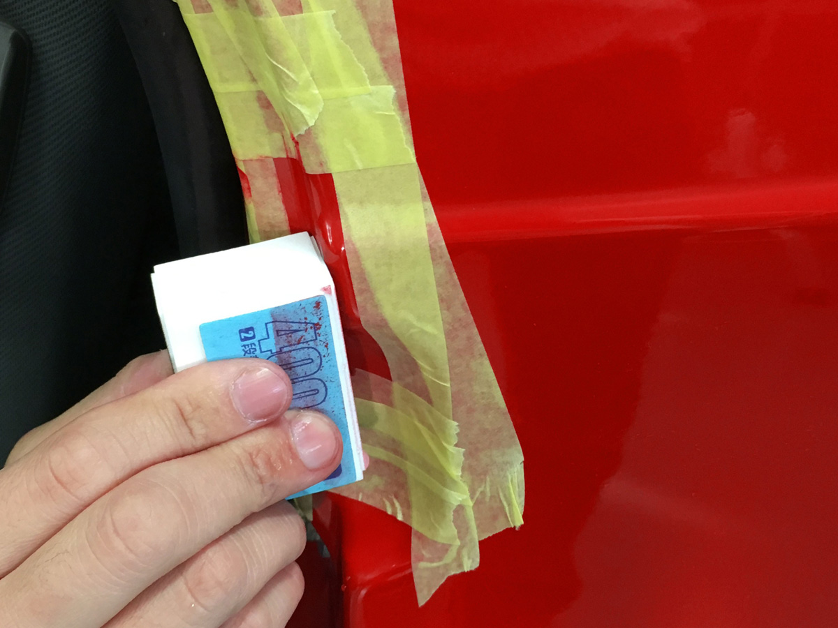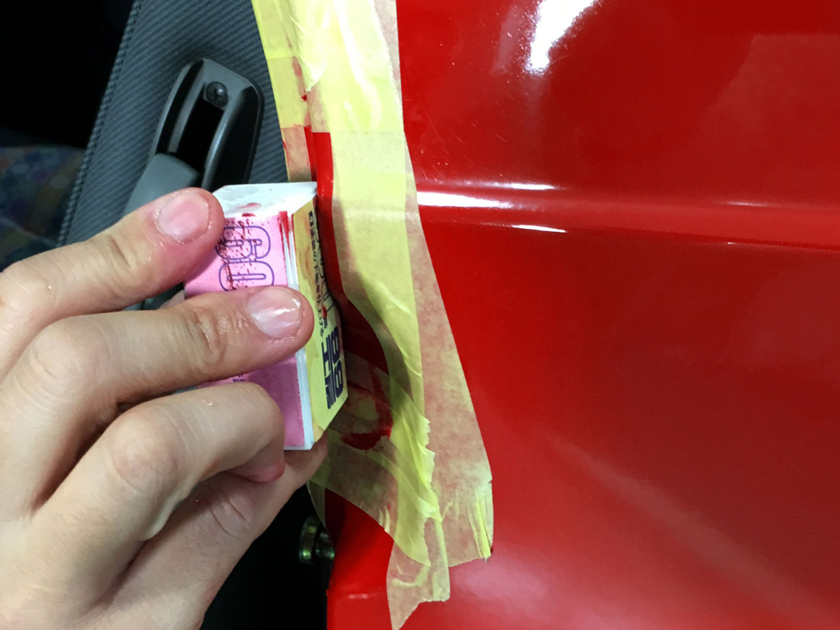 1つ目は、段差落とし。キズに凹みや膨らみが残ったまま塗装すると、その形状のまま仕上がってしまいます。今回は事前に残っていた塗装跡(膨らみ)を『サンドキューブ』で磨き落とし段差を落とします。