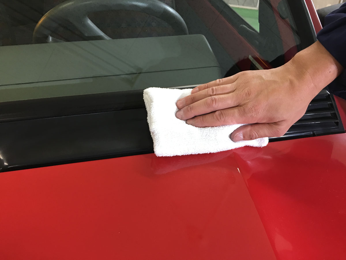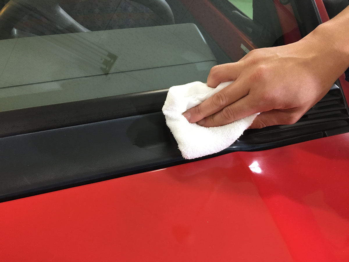 今回は、“ブラックパーツ”、樹脂製の黒色の未塗装樹脂のツヤ再生を実施します。車にはデザインのアクセント的な要素もあり、車の新旧に関わらず黒いパーツが多く使われています。黒いパーツは「黒」がしっかり際立っていると、車全体を引き締める効果がありますが、劣化し白ぼけてくると、車は何となく古ぼけた印象に見えてしまいます。「FIAT-PANDA(フィアット:パンダ)」にも多く使われているブラックパーツですが、手始めに“カウルトップパネル”のツヤ再生を行ってみます。