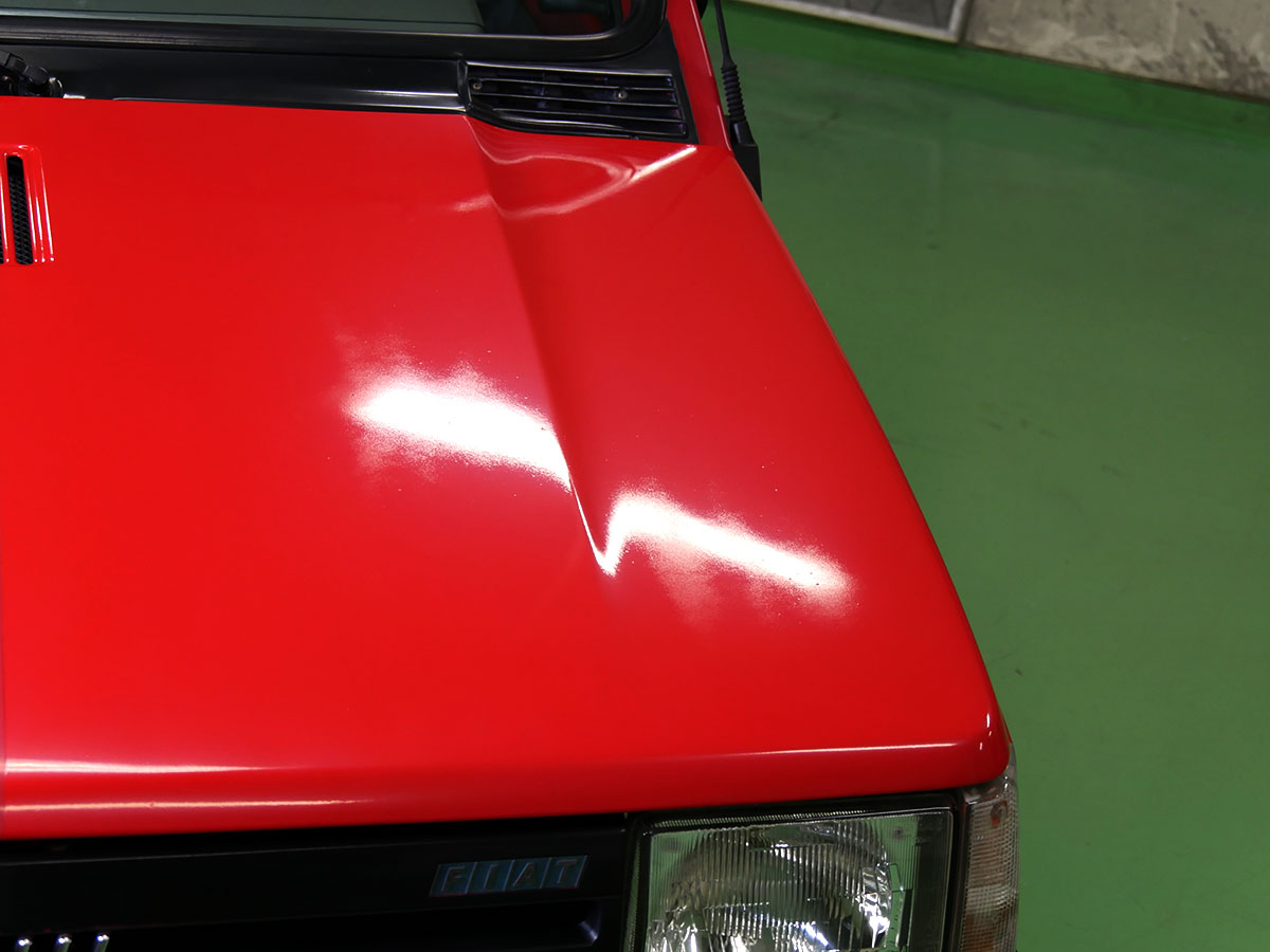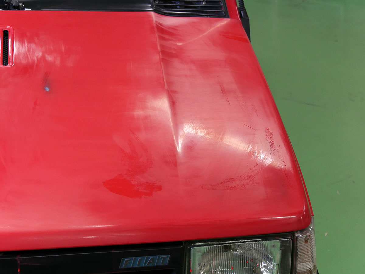 前回はブラックパーツのツヤ再生で外装の引き締めを実施してきました。本来ならこちらで「FIAT-PANDA(フィアット:パンダ)」の外装の再生は完了なのですが、Vol.4でも報告させていただきましたように、コンパウンドで蘇らせましたボンネットの塗装に関しては予想以上に劣化が進んでおり、磨いて除去できないシミなどもありました。特に、鳥の糞などの外的ダメージを受けていた部分だと思われますが、塗装が盛り上がったりヒビが入っていた部分もあり、磨いたことでそれらの塗装部分が薄くなってしまい下塗り塗装が透けてしまうという状態が発生していました。