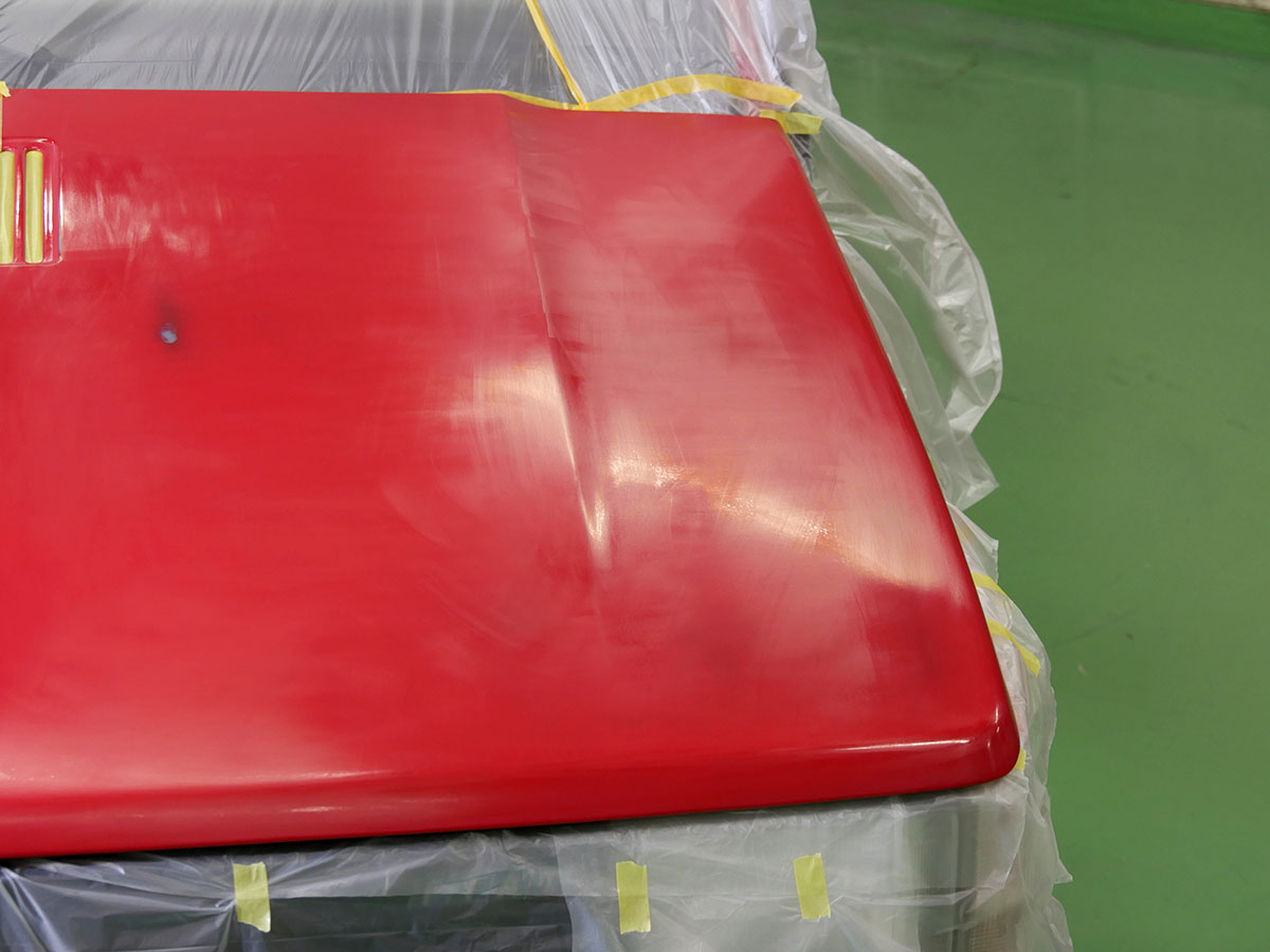 いかがでしょうか、鮮やかな赤色になりました。ご覧のとおり塗装表面の平滑差がないため映り込みのようなものがありませんが、これは塗装後の“磨き”作業を行うことでキレイに仕上がります。表面はすぐに乾きますが、塗装内部に残った溶剤分を抜き切るために、最低でも1週間は乾燥させてから磨いて仕上げたいと思います。