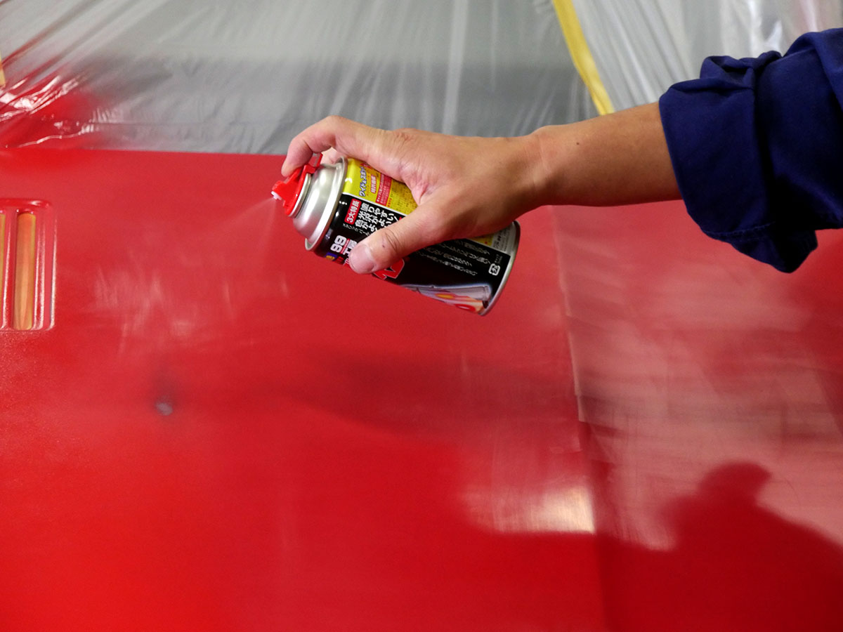 今回も定番色でのカラーラインナップはないため、調色システム『オーダーショップ』でカラーを作成しました。『ボデーペン』は正立状態でスプレーするのがベターな使い方ですが、今回スプレーするボンネットは天を向いていますので、横向きに近い状態でスプレーすることとなり最後まできれいに使い切るのがどうしても難しくなります。塗料は余分目にご用意いただくと良いと思います。