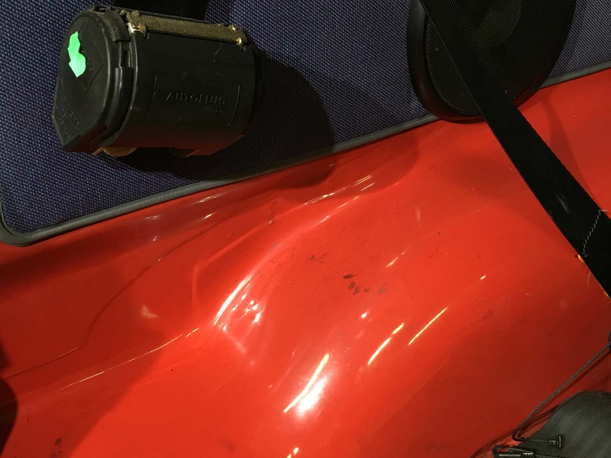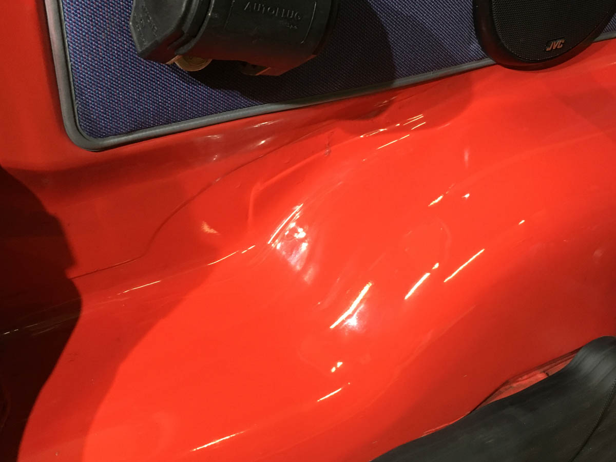 すっかりキレイになりました。眩しいばかりの赤色です。 同様に車内で塗装がむき出しとなった部分の汚れが気になる部分を磨きあげました。専用スポンジはサイズが小さいので、車内の磨きにはとても便利です。