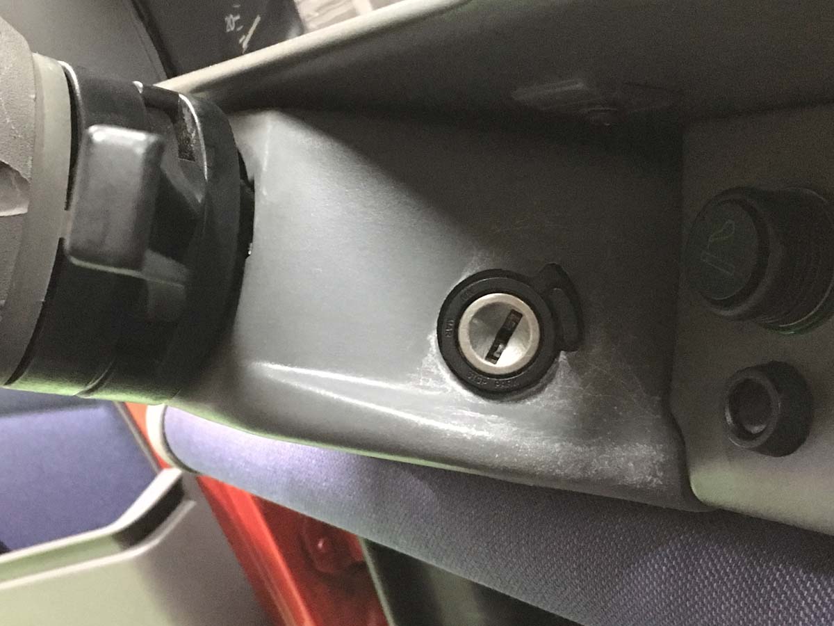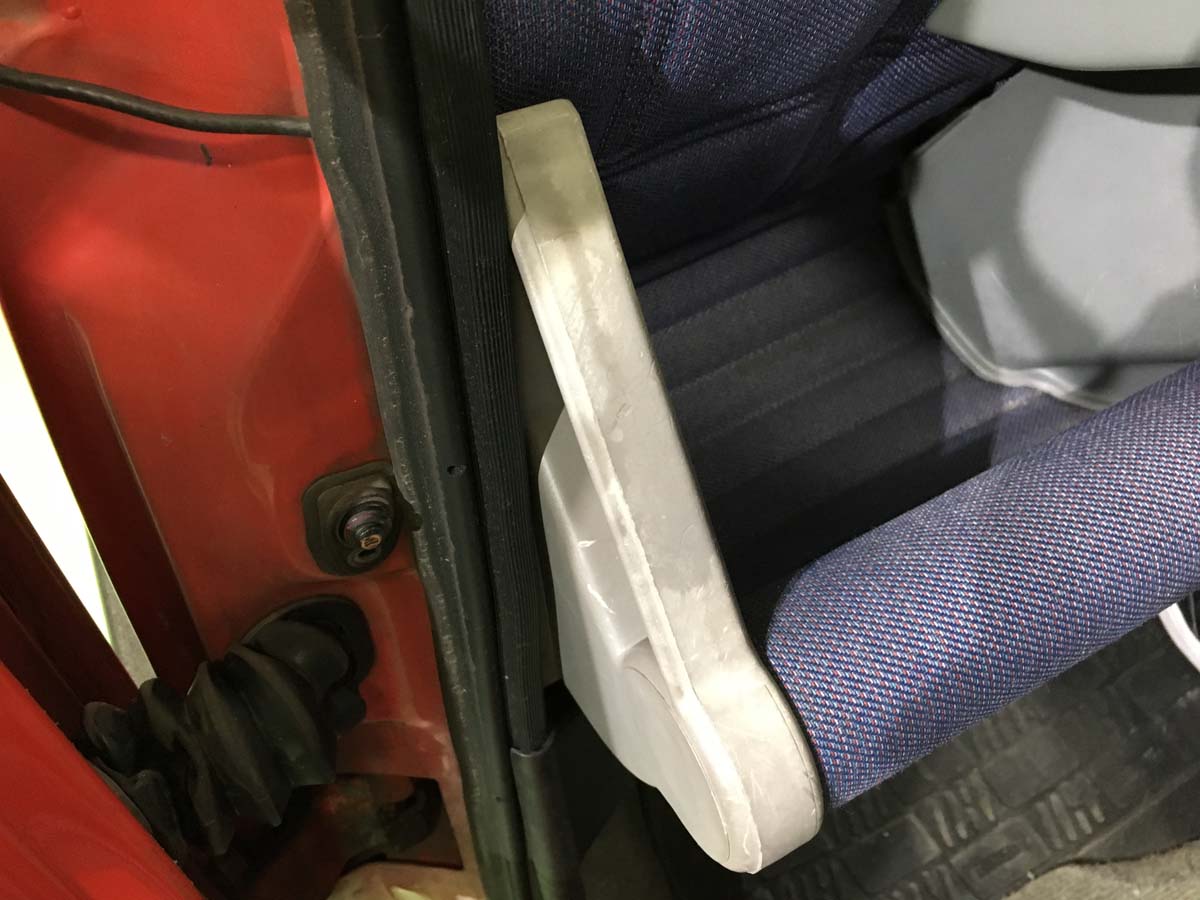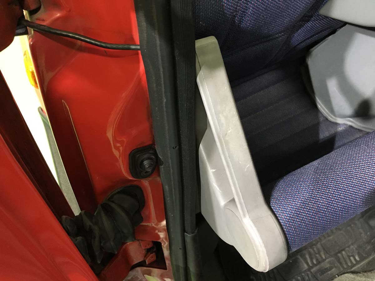そして車内クリーニングの最後の作業です。 車内にある塗装部の小キズや汚れをクリーニングします。こちらの「FIAT-PANDA(フィアット:パンダ)」ですが、車内にもボディ塗装と同じように赤の塗装部がたくさんあります。特に気になっていたのは、荷室のホイールハウス上部の塗装部についたシミのような汚れです。