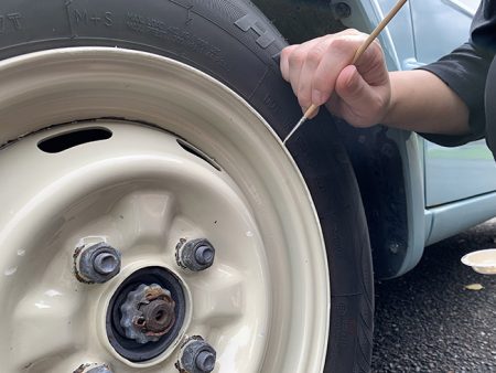 こんにちは。 今回はホイールの塗装はがれを補修します。といっても、スプレー塗料を使ってのがっつり補修ではなく初心者向けのキズかくし程度の補修です。 パオのホイールはスチール製でこのような状態となっていました。パッと見、汚…