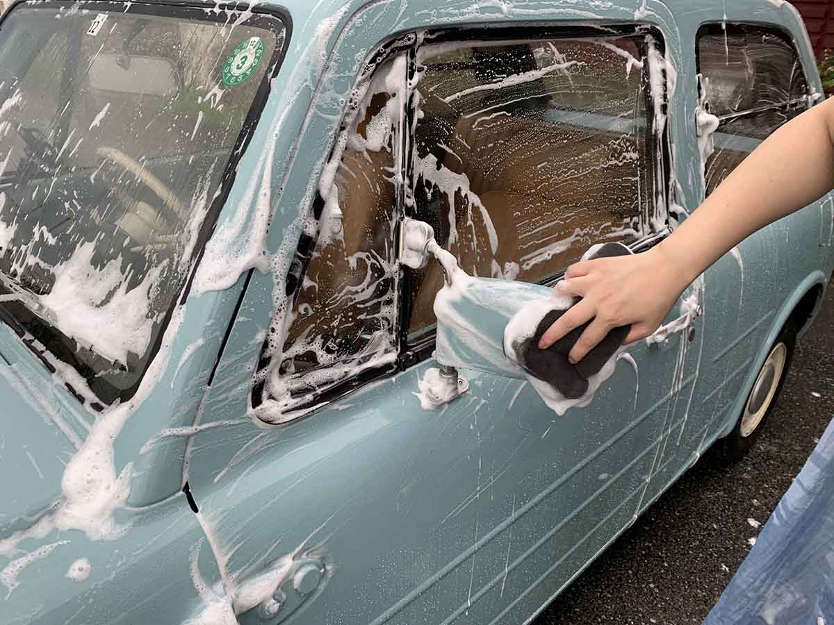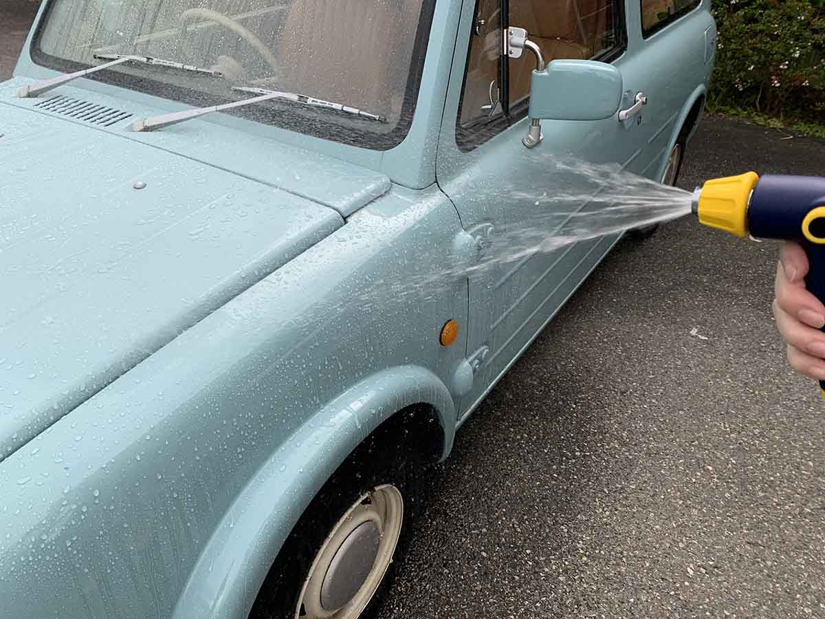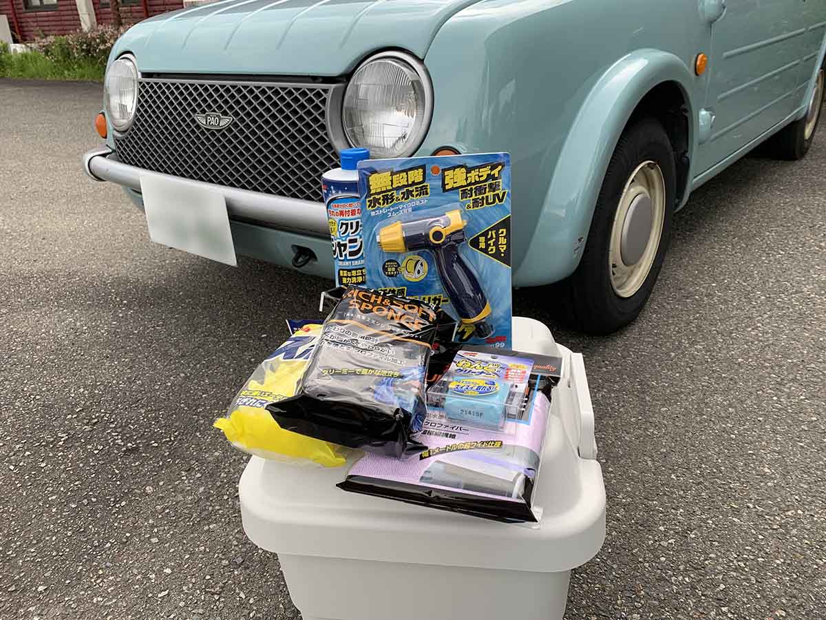 実際に傷んでいる箇所をチェックするために、まずはシャンプー洗車で表面の汚れを落としていきます。前回、到着した「NISSAN-PAO(日産:パオ)」、やってきて早々に洗車されることになります。そして、初めての洗車です!