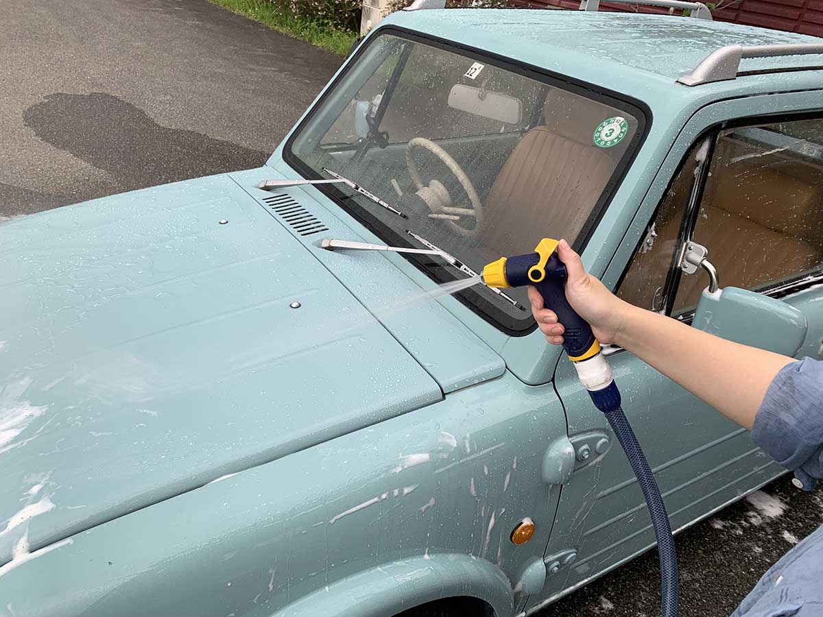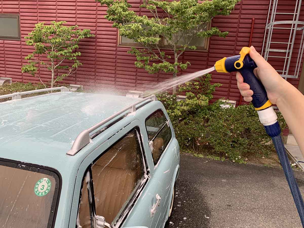 全体をシャンプー洗車できたら、水で洗い流していきます。