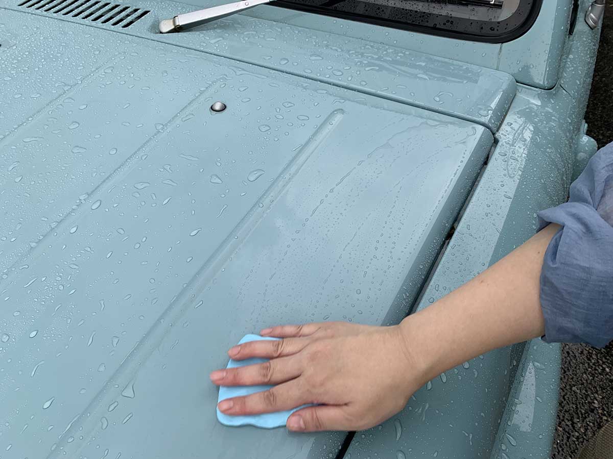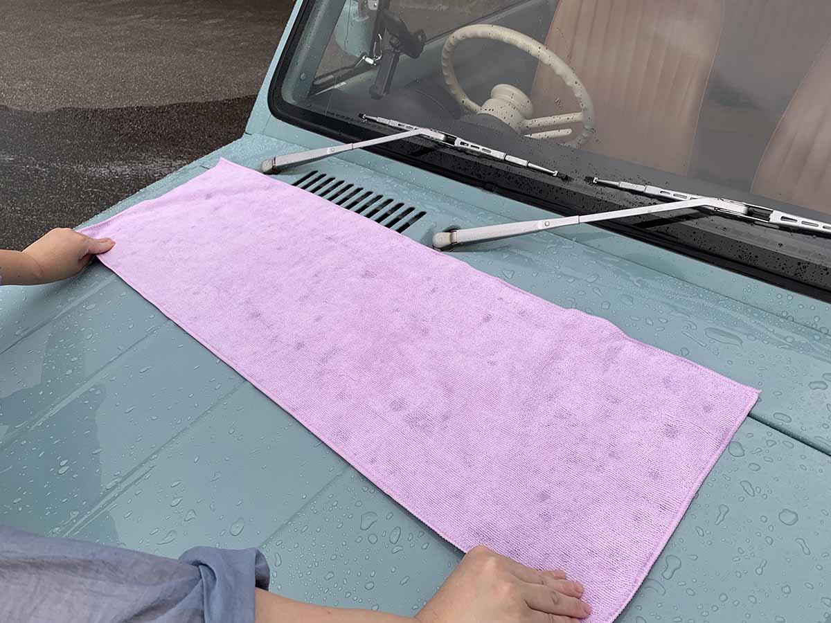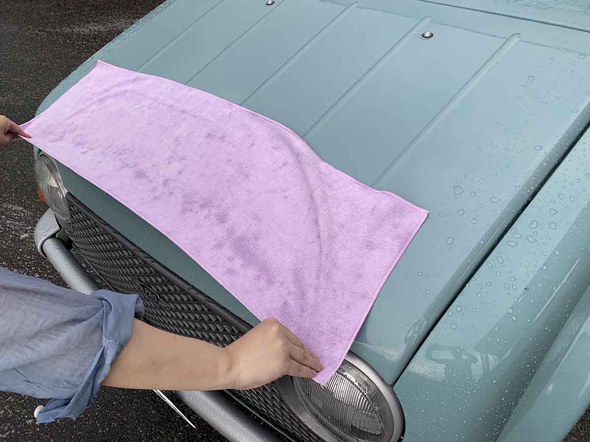 ボンネットを中心に鉄粉取りを行ったら、最後に水滴を拭きとっていきます。