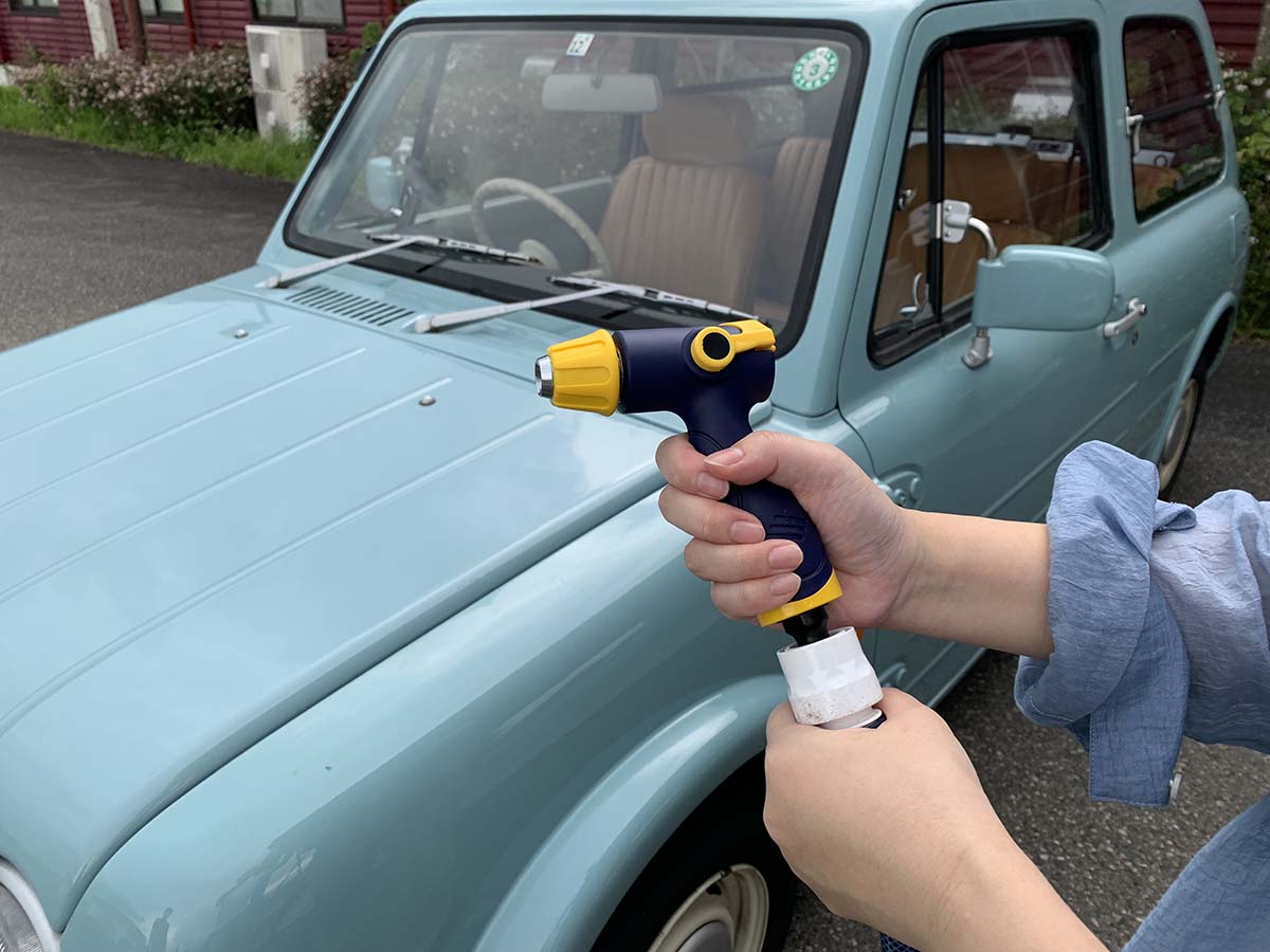 洗車作業で起こりそうな衝撃を想定してボディも頑丈にできているのが、通常の園芸用の散水ノズルとは大きく違う点です。