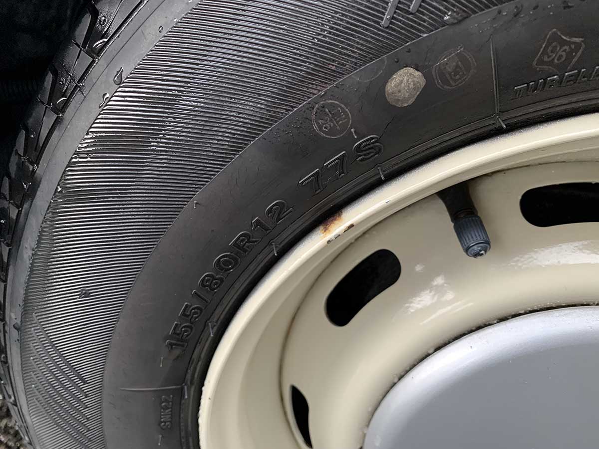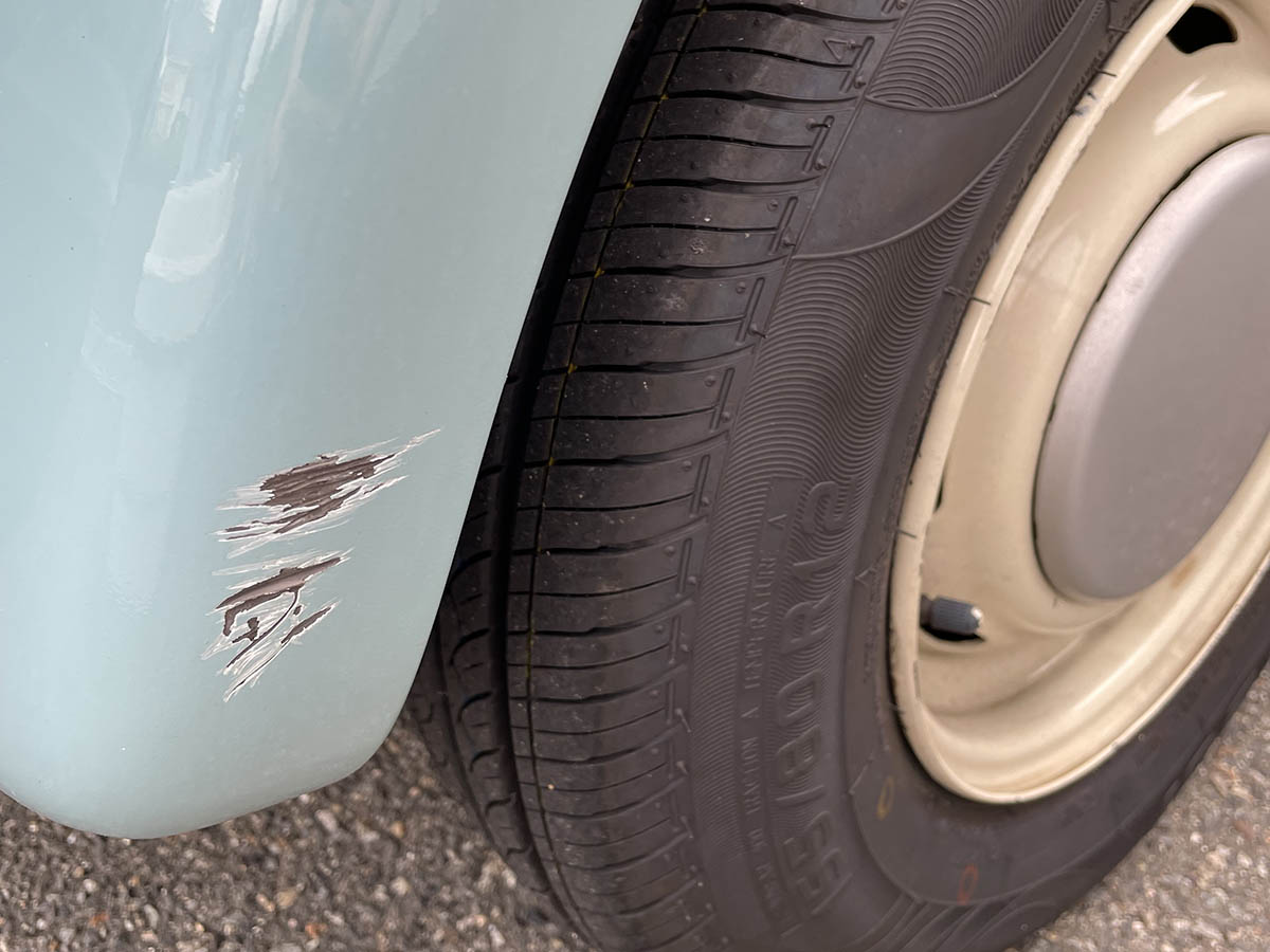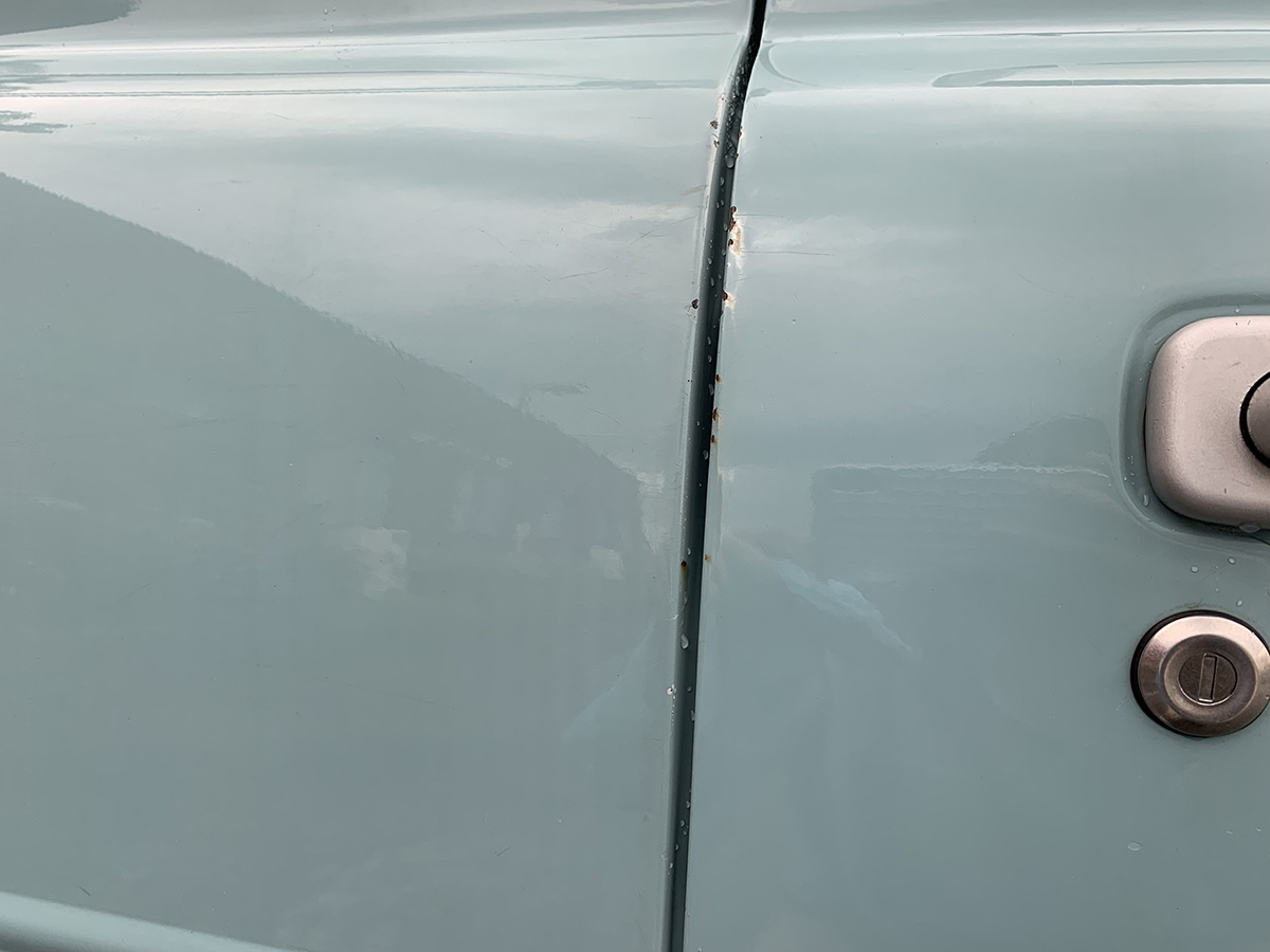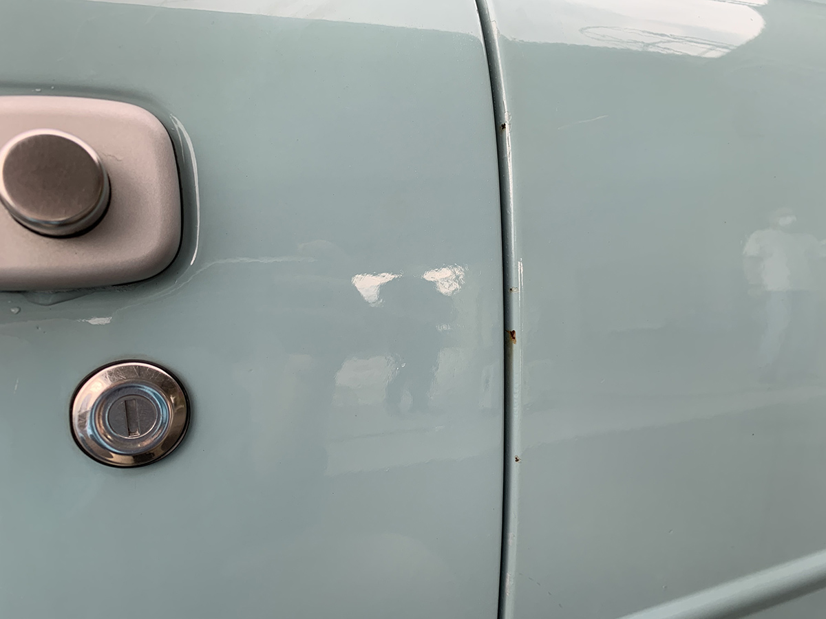 鉄粉までしっかり取れて、一見キレイになったように見えるパオですが、やはりそこは30年モノ。傷んでいる箇所は多いです。まず、ボディには洗車では落とせなかった黒い汚れ?シミ?が残っています。