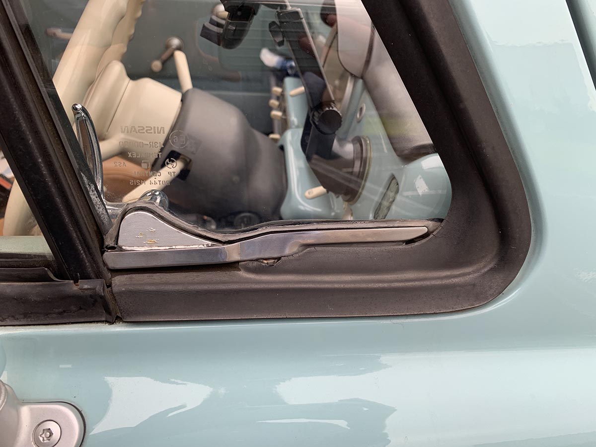 比較的、「NISSAN:PAO(日産:パオ)」には黒のパーツが少ないのですが、唯一ウインドウ周りについているゴムパーツは、汚れと白化でみすぼらしい状態・・・