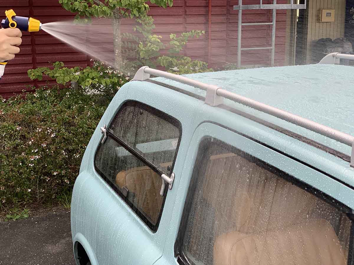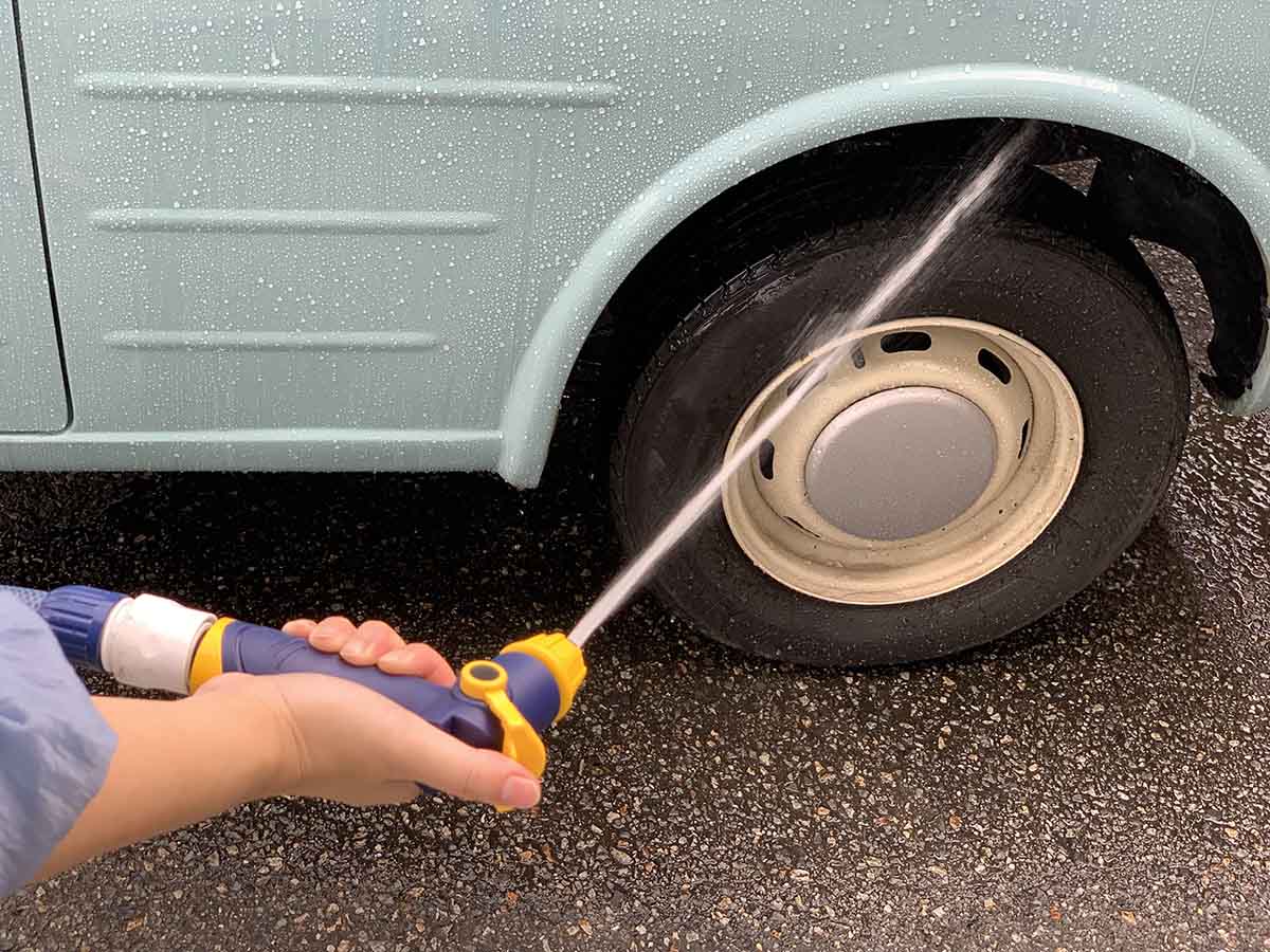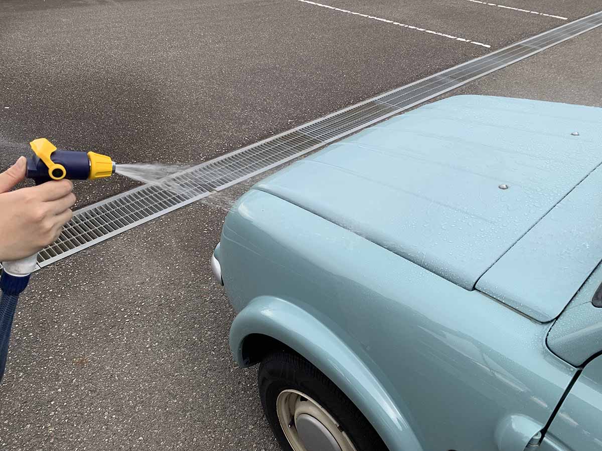 まずはボディに水をかけて、ボディに付着した砂ボコリや泥汚れなどを洗い流していきます。洗車キズを防ぐためにも洗車にはこの水洗いがとても大事なので、丁寧に水洗いしていきましょう。